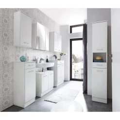 - Contenu de la livraison : Salle de bain comprenant 1 meuble avce vasque en céramique, 2 colonnes de salle de bain & 1 armoire de toilette avec éclairage, interrupteur et prise.