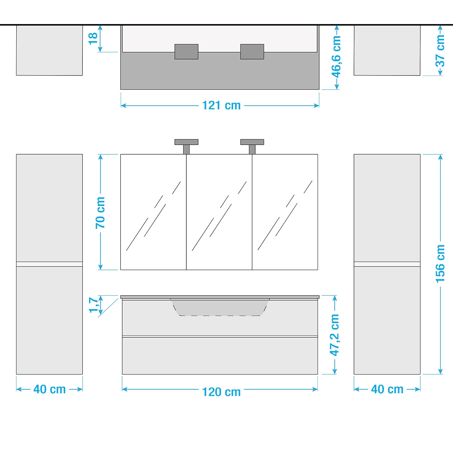 - Armoire de toilette (LxHxP) : 120 x 70 x 18 cm