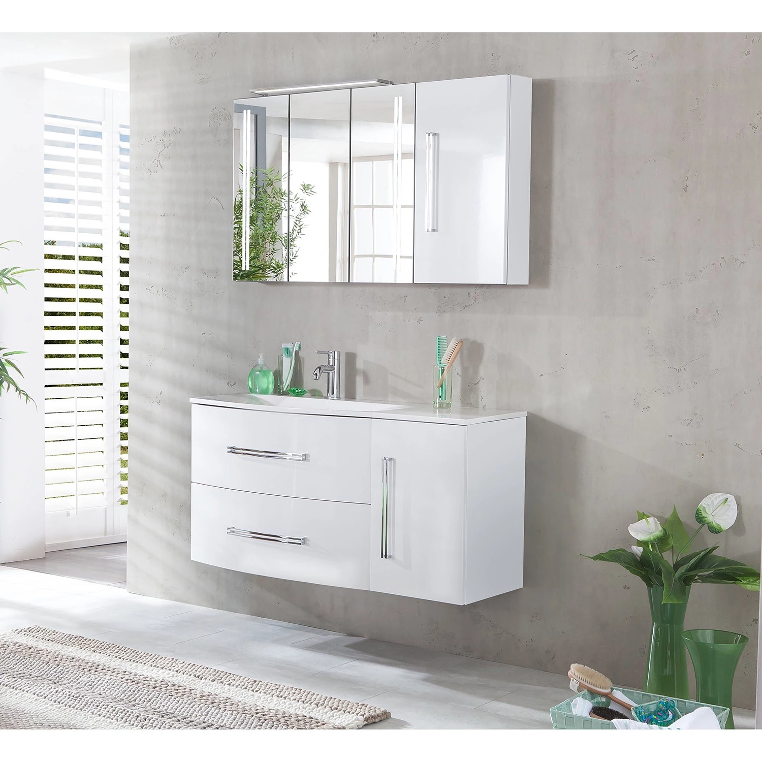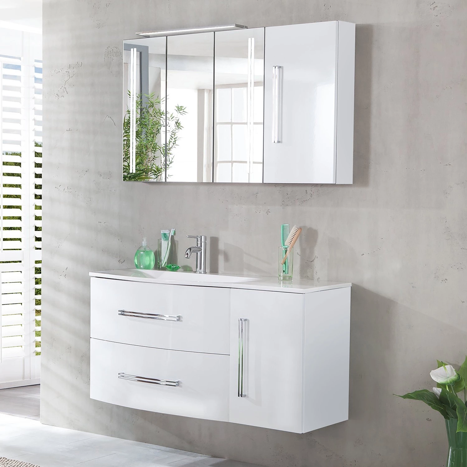 - Contenu de la livraison : Salle de bain comprenant 1 meuble avec vasque en fonte minérale, avec armoire sous vasque, 1 meuble haut et 1 armoire de toilette avec éclairage