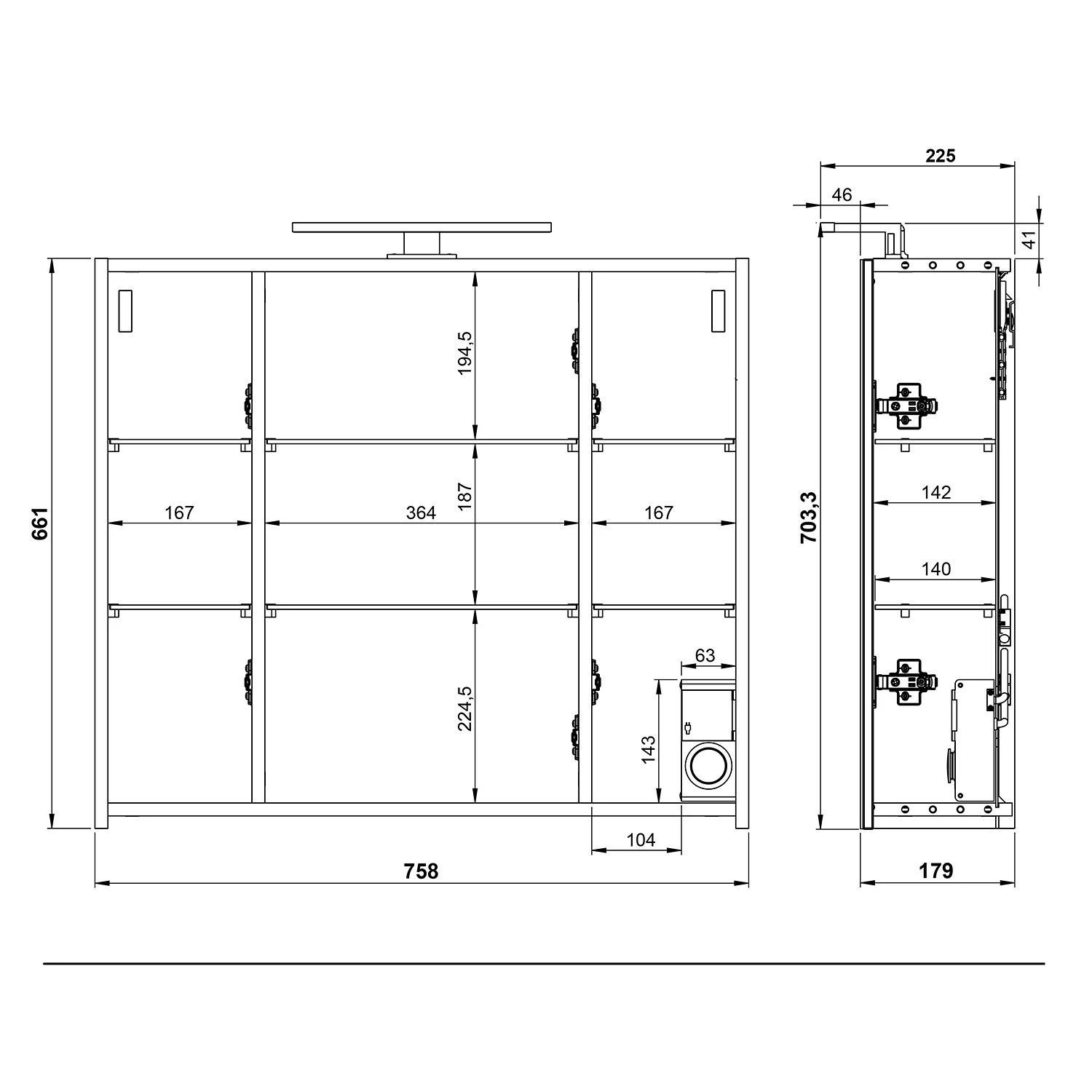- – Compartiment derrière les portes (sans les étagères) : 66,9 x 52 x 32 cm