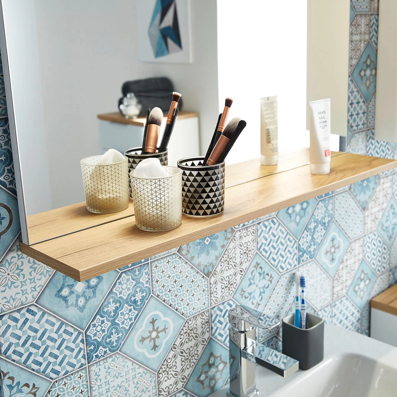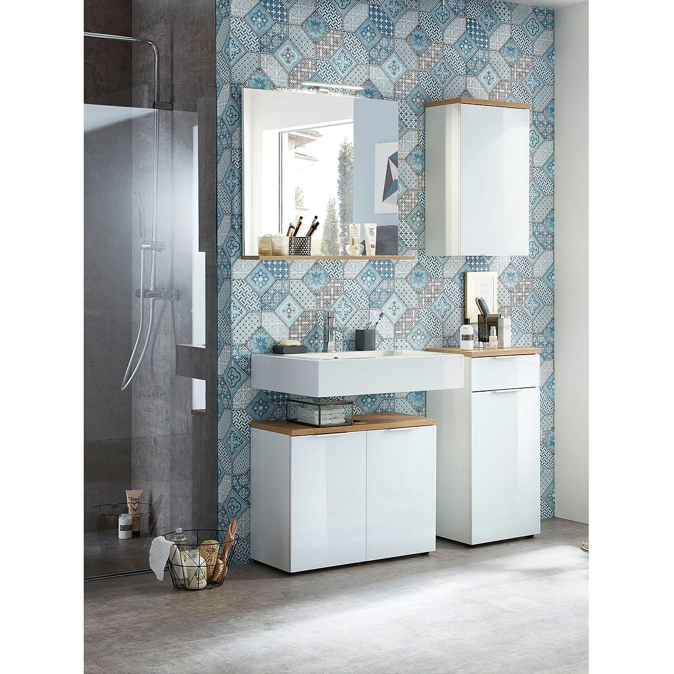- Contenu de la livraison : 1 miroir, 1 meuble sous lavabo, 1 meuble haut et 1 meuble bas, sans accessoires