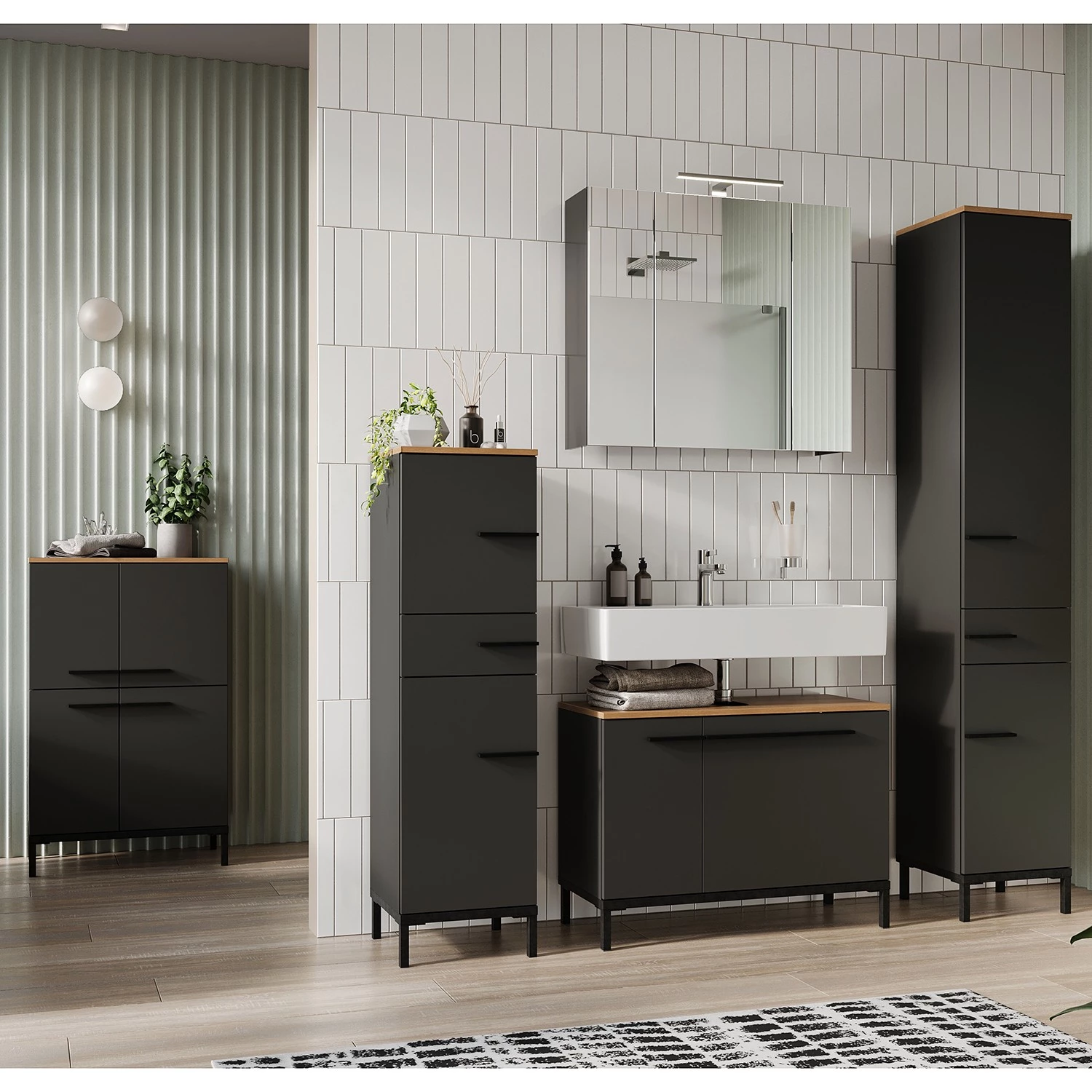 - Contenu de la livraison : Ensemble de salle de bain comprenant 1 meuble sous lavabo, 1 meuble bas, 1 colonne de salle de bain, 1 armoire midi et 1 armoire de toilette avec éclairage, interrupteur et prise