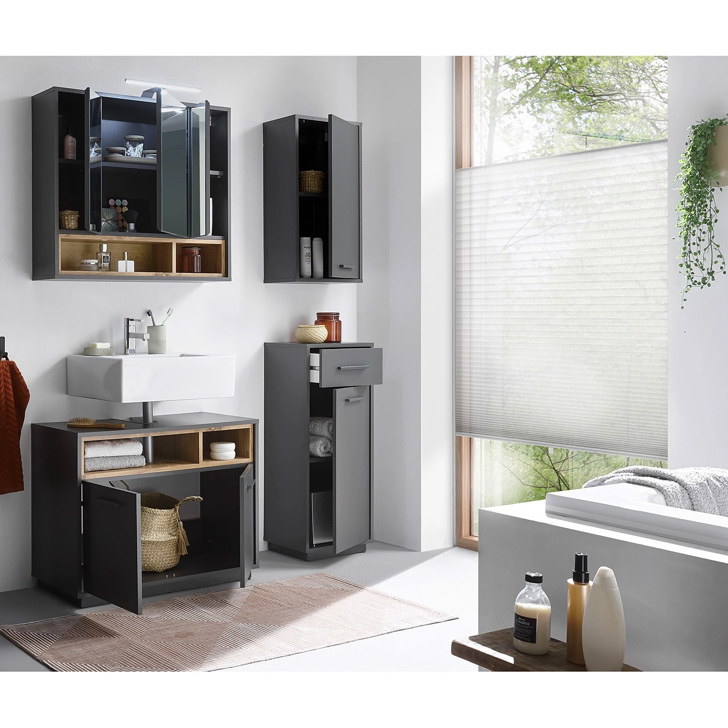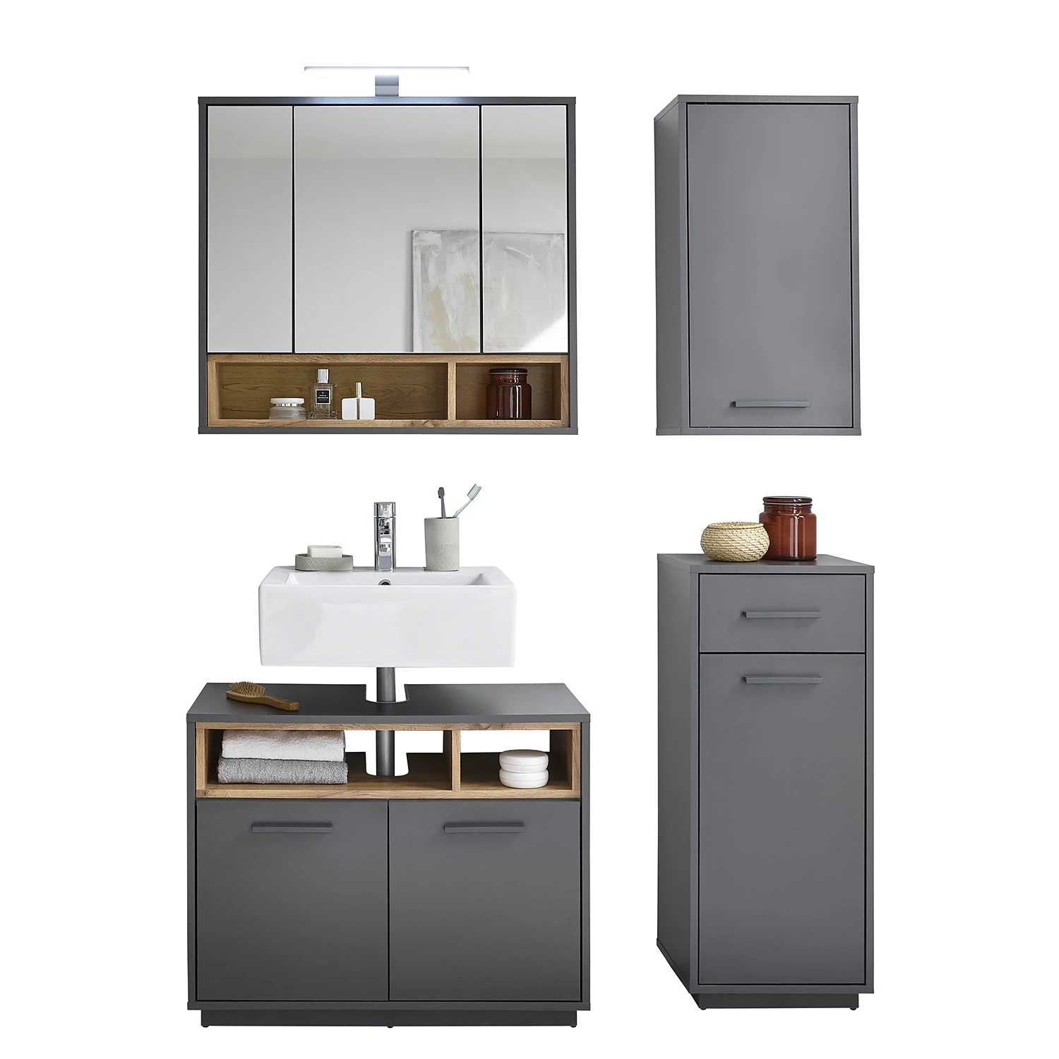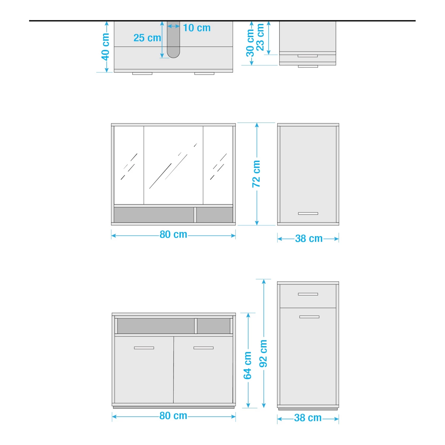 - Contenu de la livraison : Salle de bain comprenant 1 meuble sous lavabo, 1 meuble bas, 1 meuble haut et 1 armoire de toilette avec éclairage LED, interrupteur et prise (température de couleur : blanc froid)