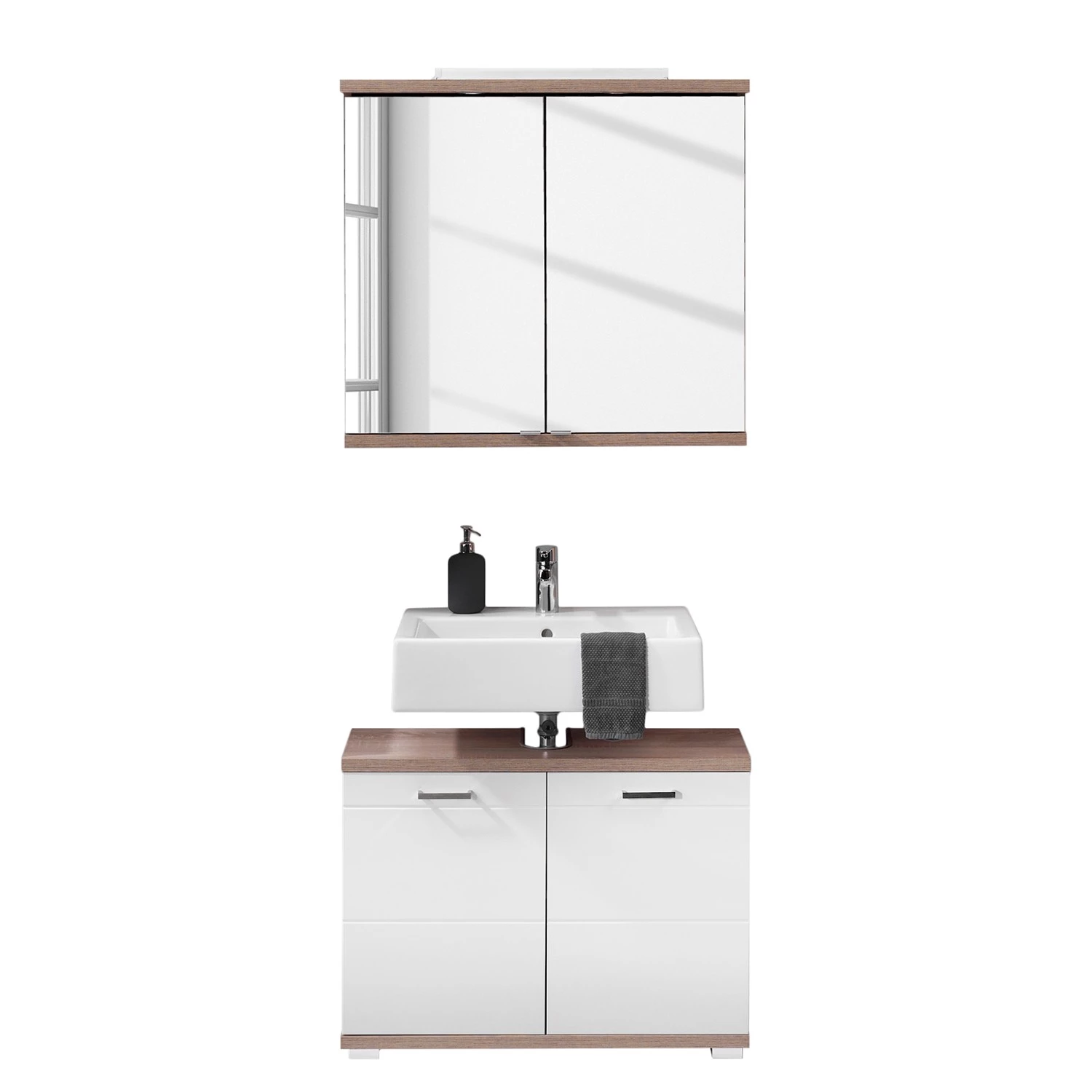 - Contenu de la livraison : Ensemble de salle de bain comprenant 1 armoire de toilette avec éclairage et 1 meuble sous lavabo