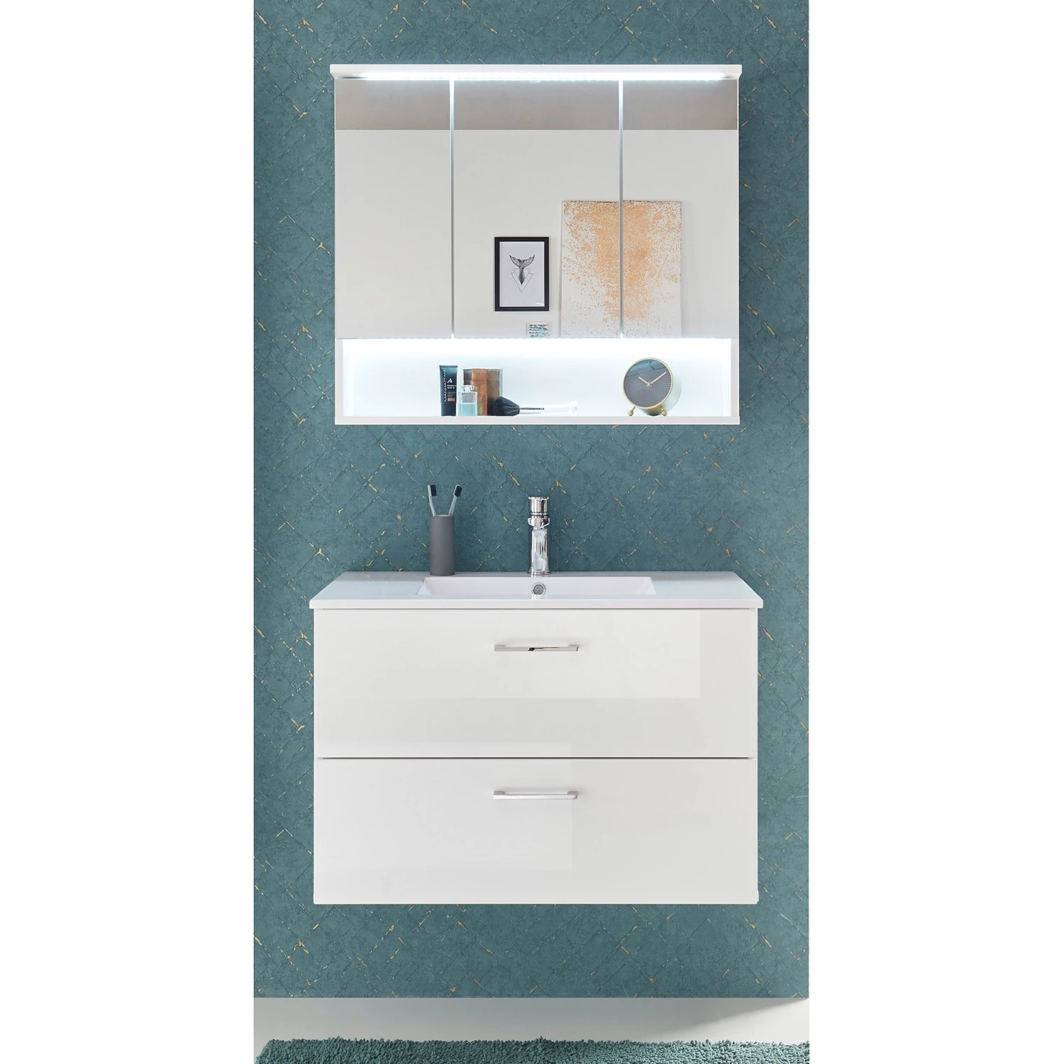 - Contenu de la livraison : Ensemble de salle de bain comprenant 1 meuble avec vasque en fonte minérale et 1 armoire de toilette