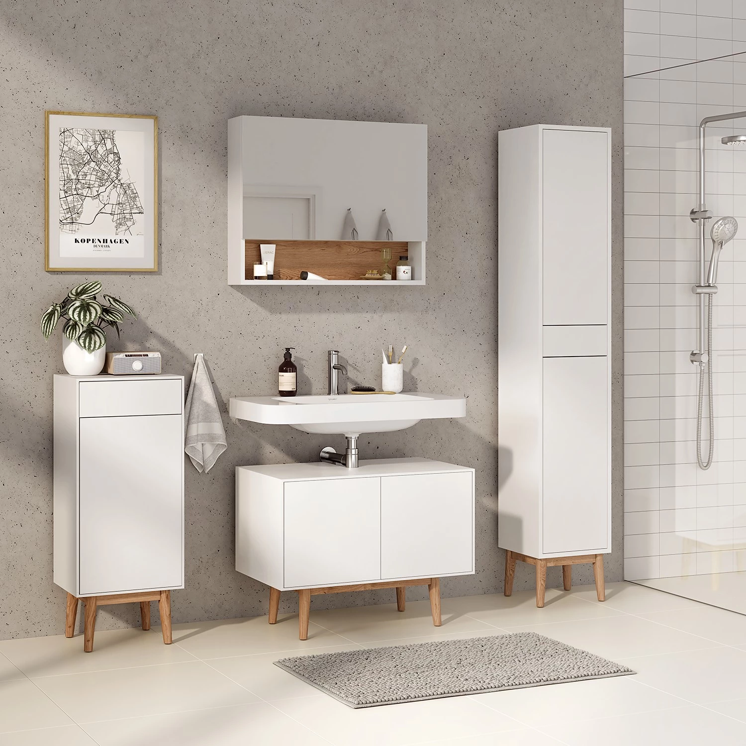 - Contenu de la livraison : Ensemble de salle de bain comprenant 1 meuble sous lavabo, 1 colonne de salle de bain, 1 meuble bas et 1 armoire de toilette