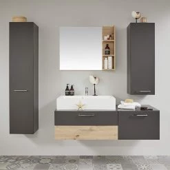 - Contenu de la livraison : Ensemble de salle de bain comprenant 1 meuble sous lavabo, 1 étagère et 1 armoire de toilette avec porte relevable