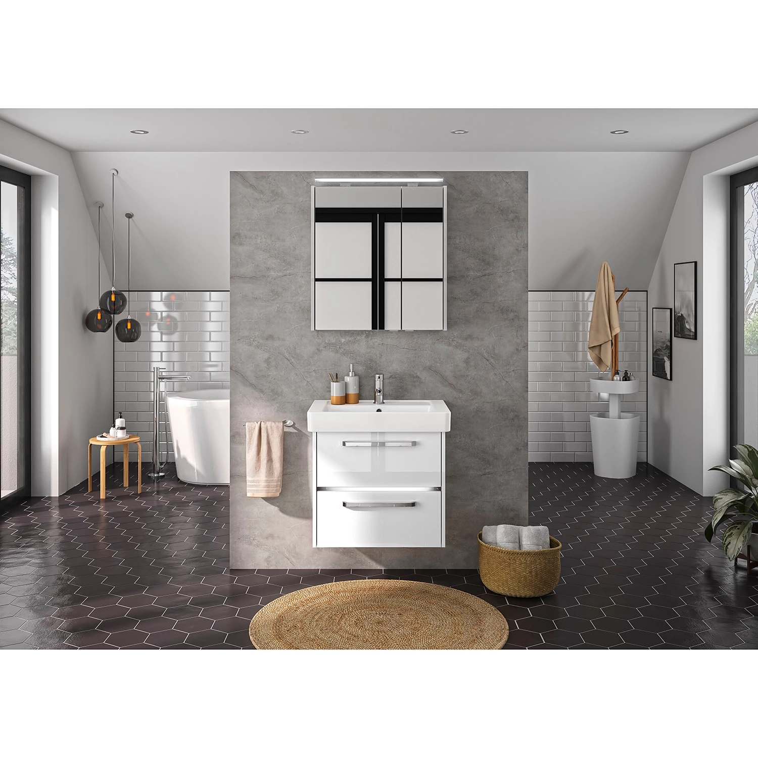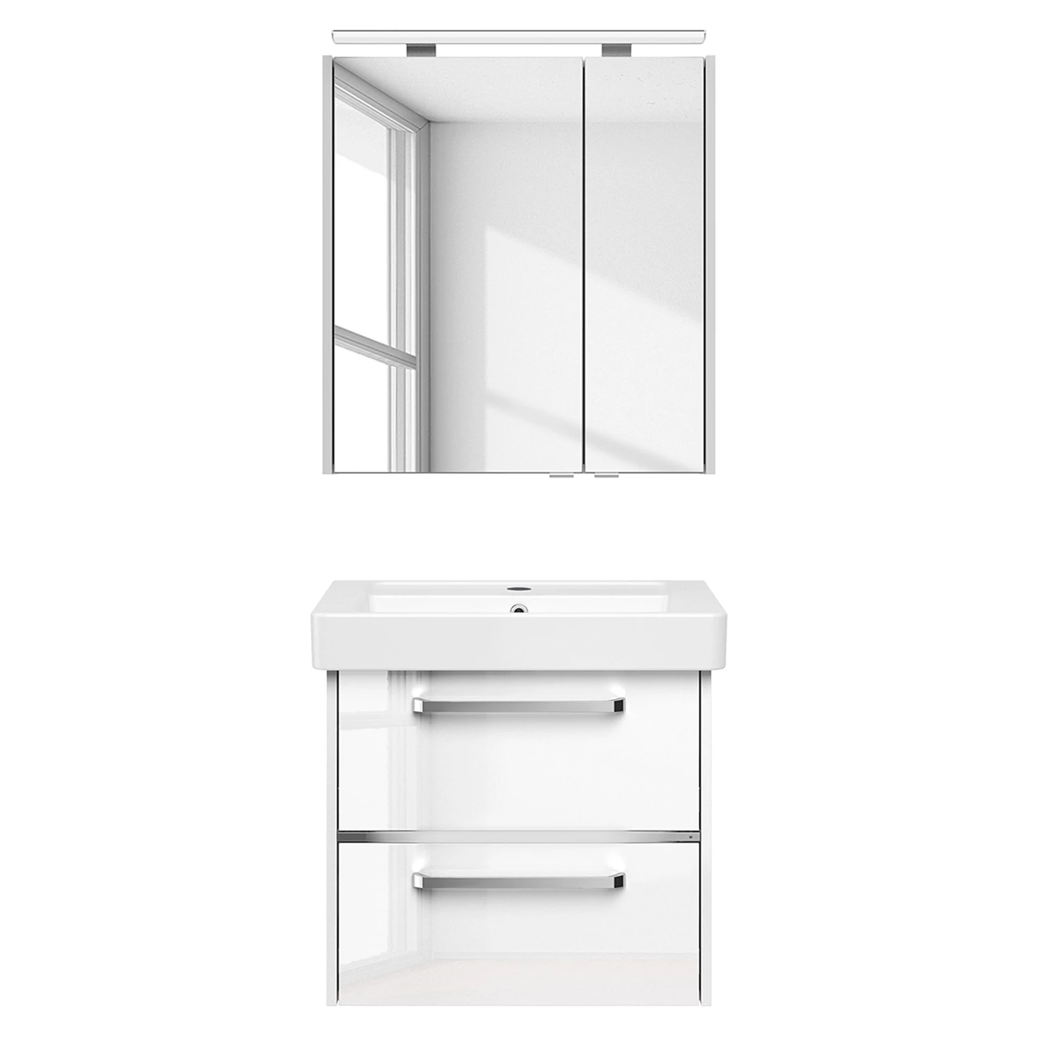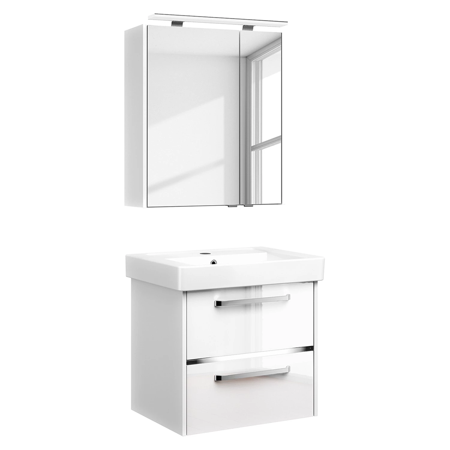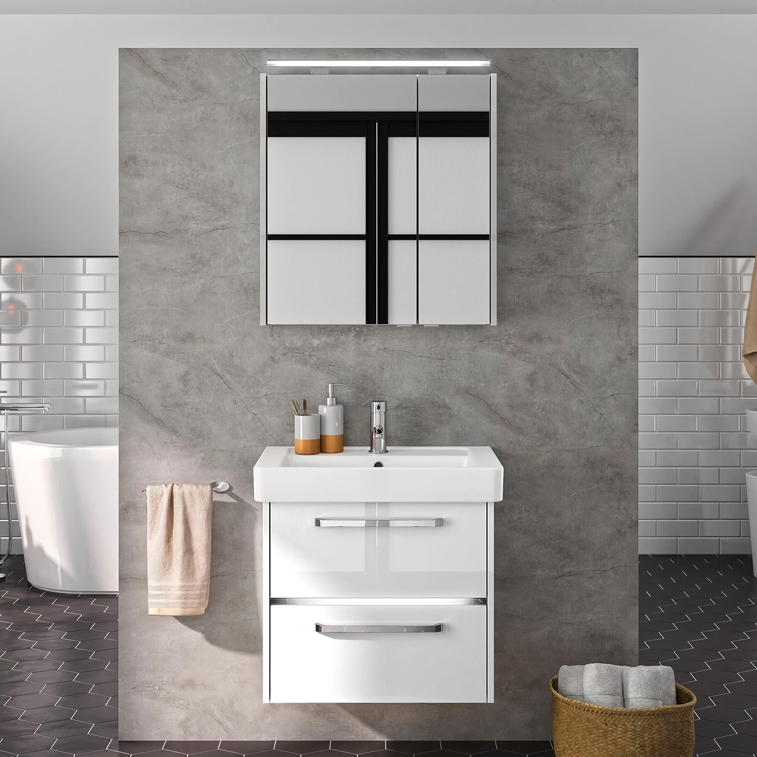 - Contenu de la livraison : Salle de bain comprenant 1 meuble avec vasque et éclairage tiroir, et 1 armoire de toilette avec éclairage