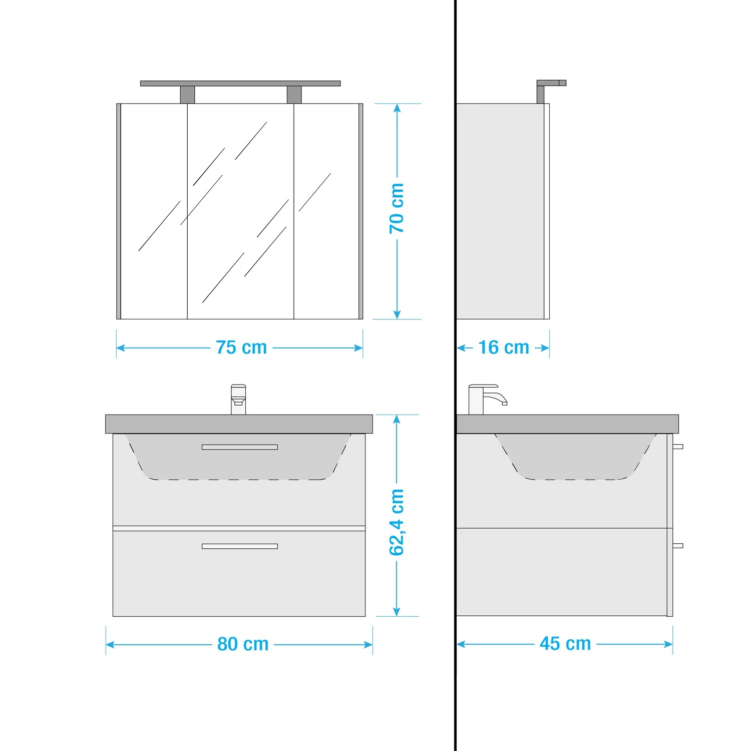 - Meuble avec vasque (LxHxP) : 80 x 62,4 x 45 cm
