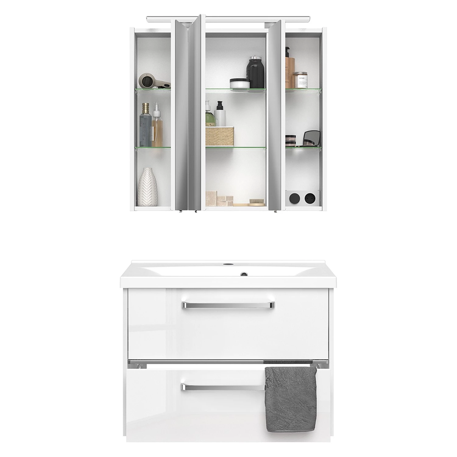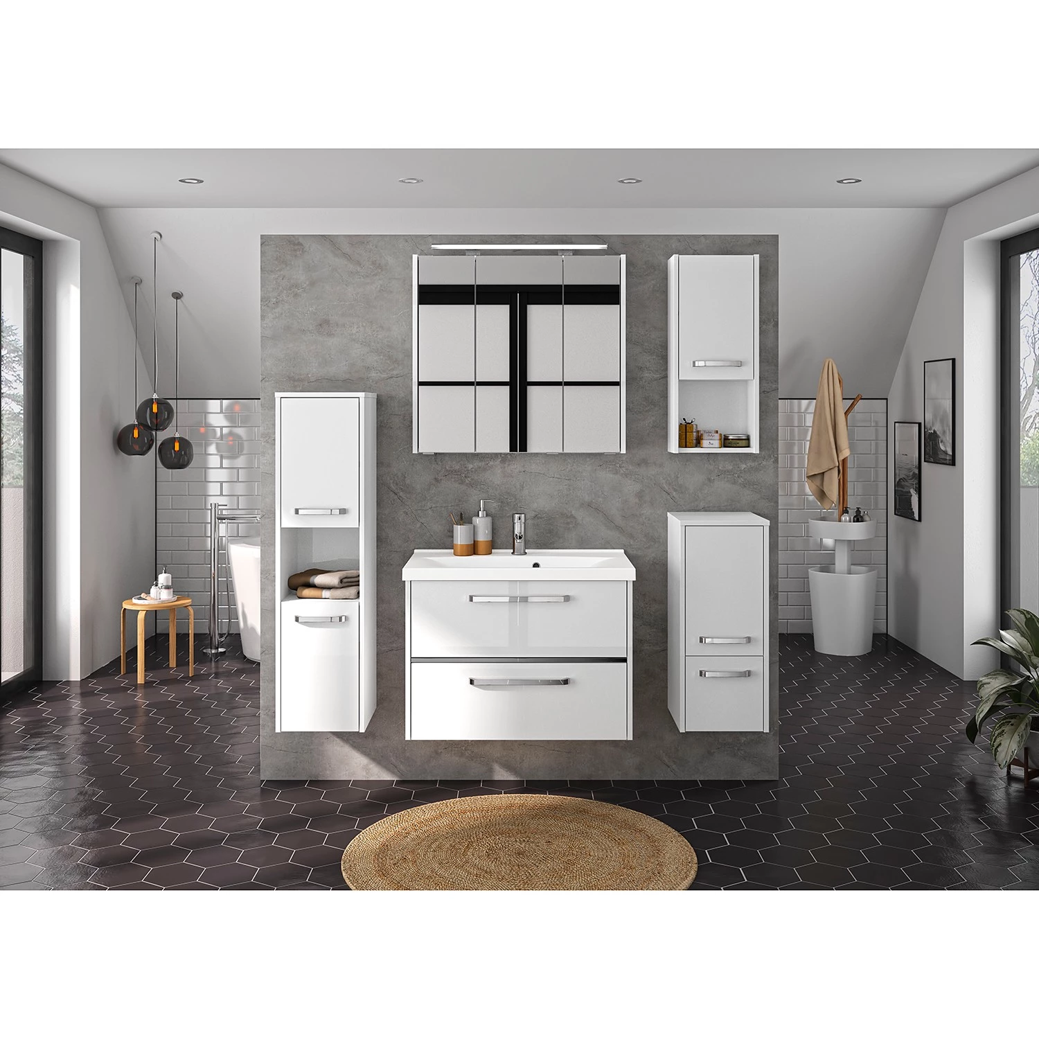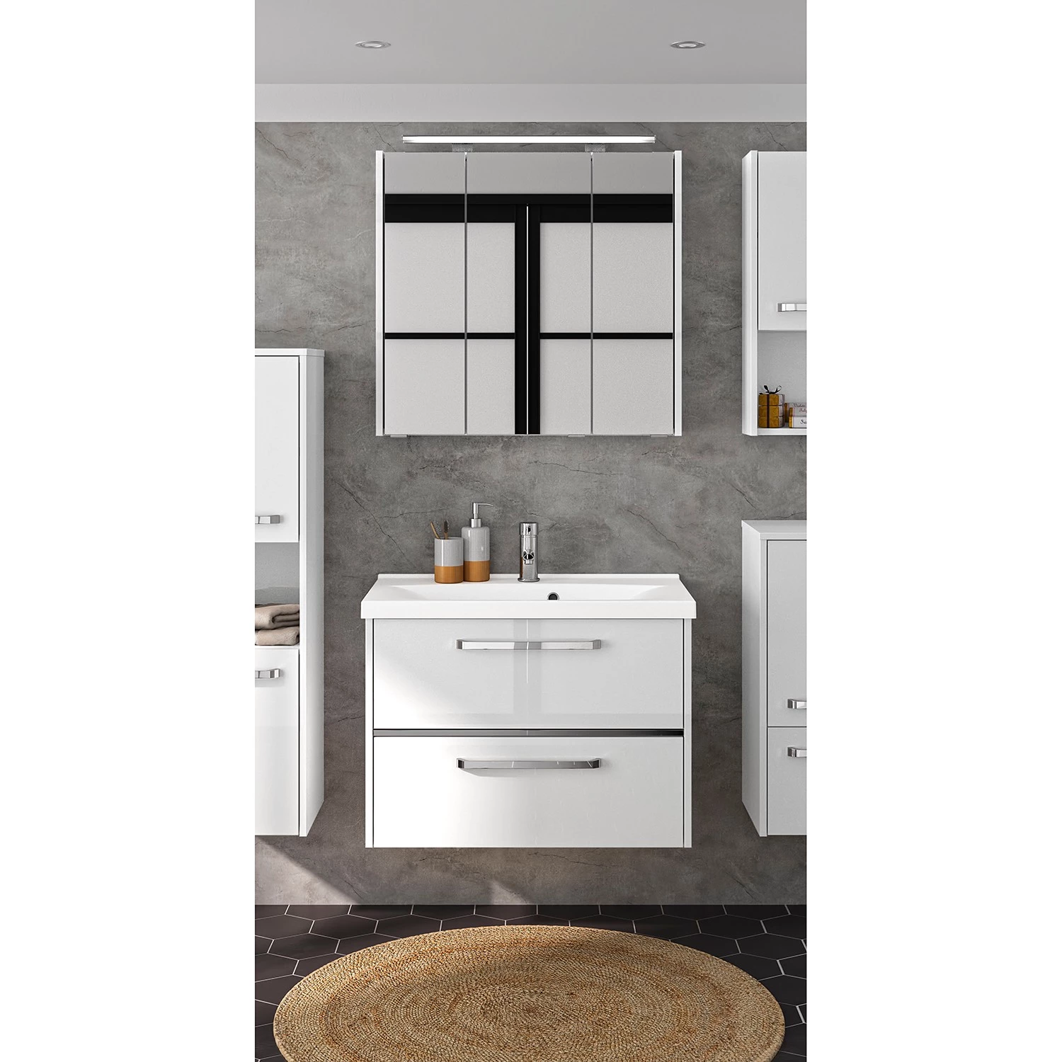 - Contenu de la livraison : Salle de bain comprenant 1 meuble avec vasque en fonte minérale et 1 armoire de toilette avec éclairage