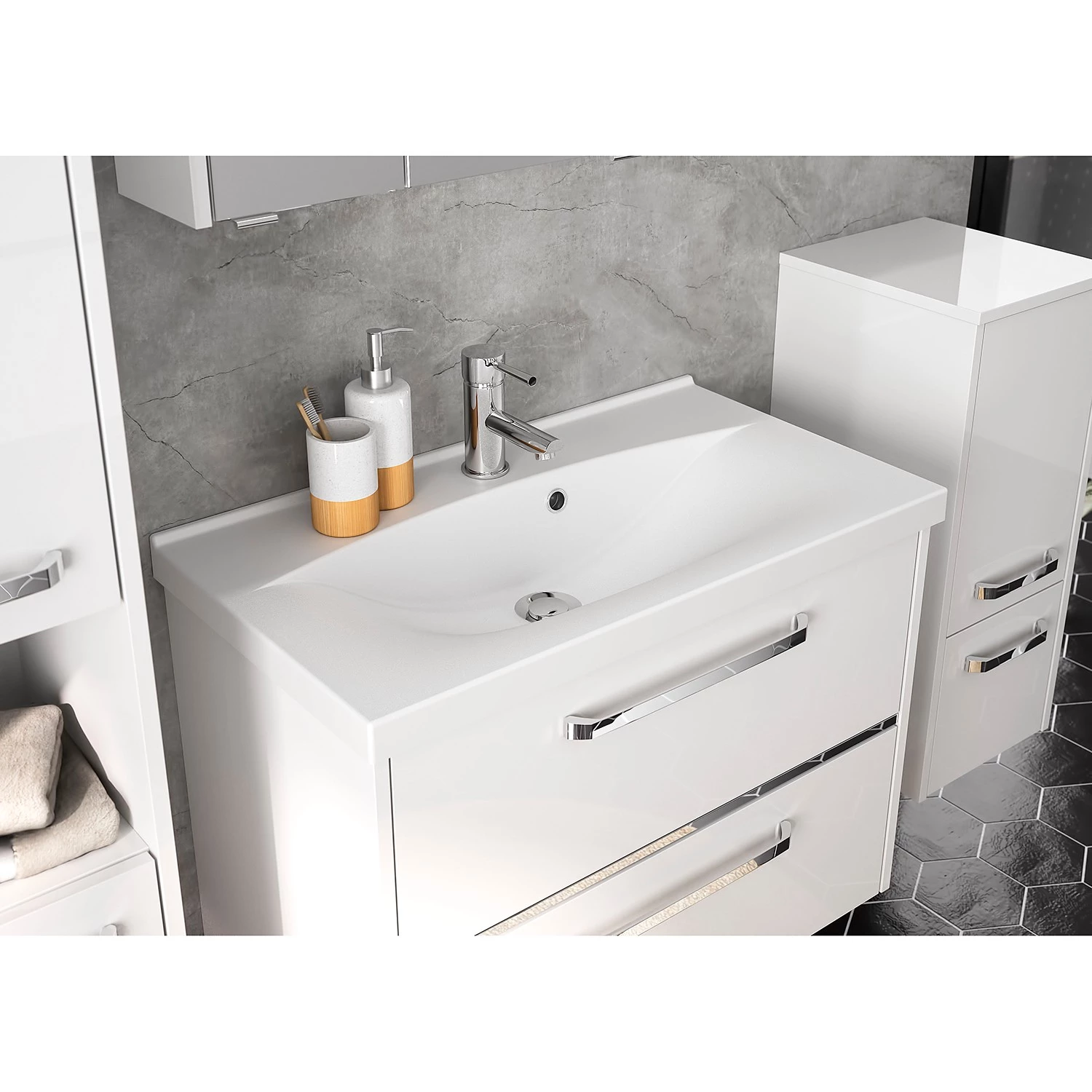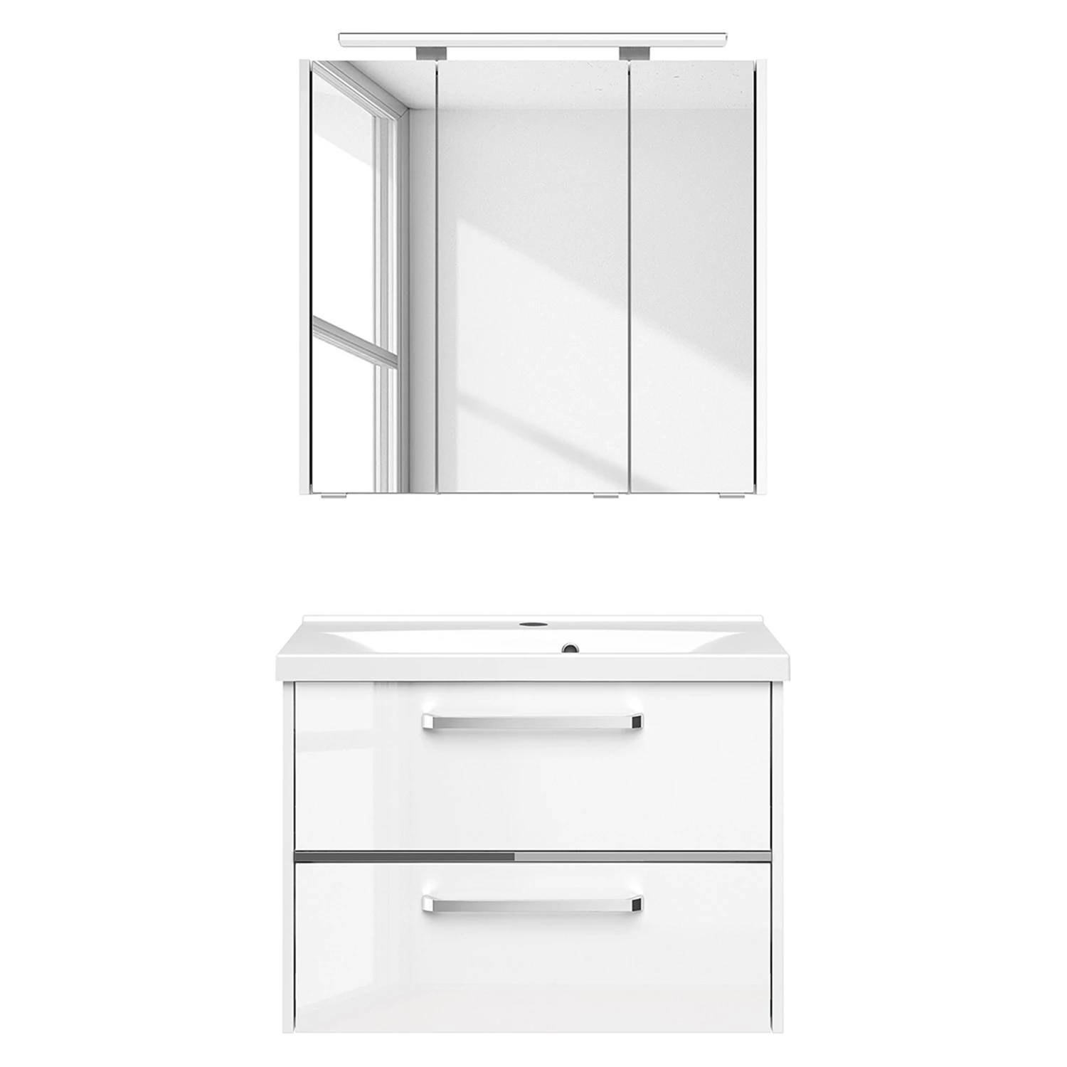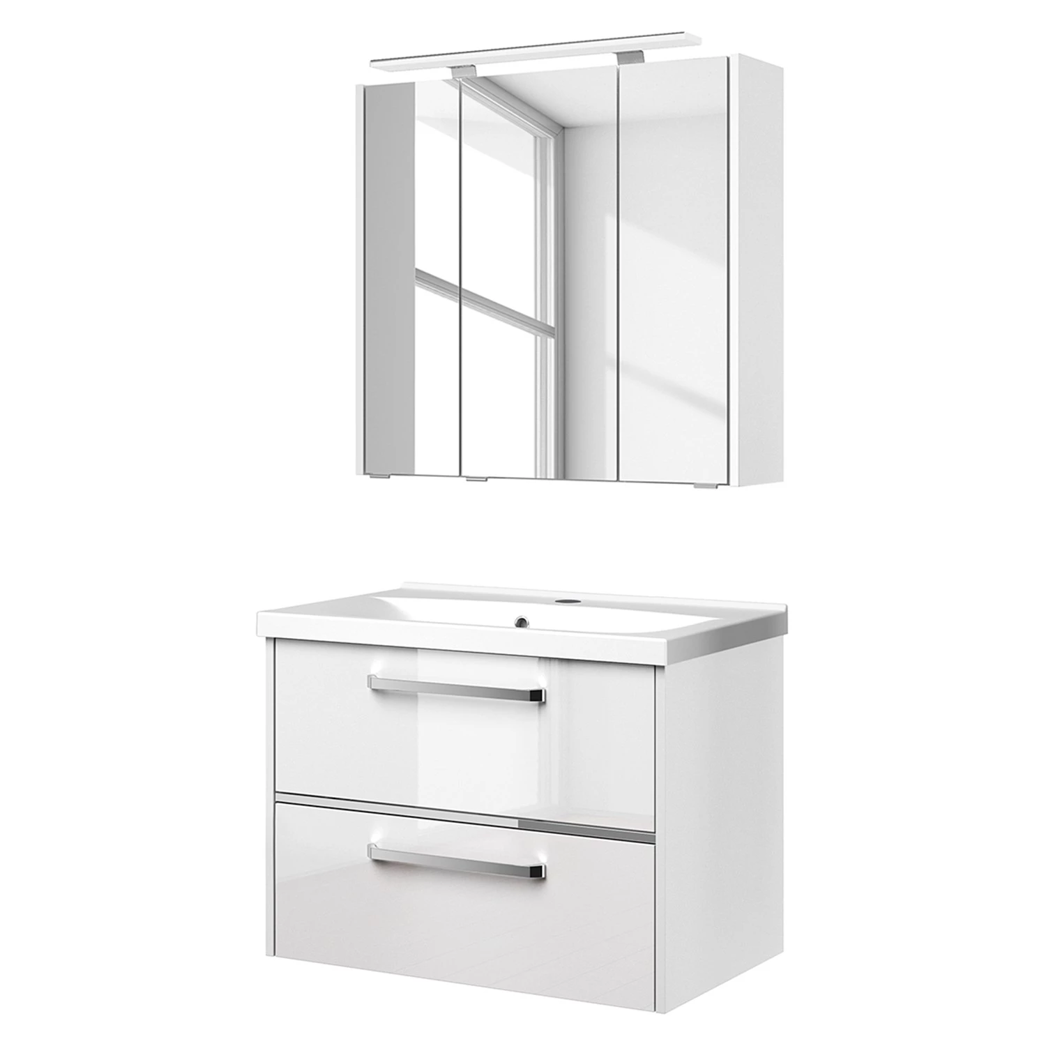 - Contenu de la livraison : Salle de bain comprenant 1 meuble avec vasque en fonte minérale et 1 armoire de toilette avec éclairage