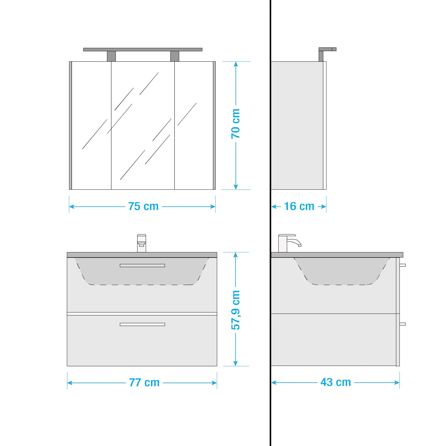 - Armoire de toilette (LxHxP) : 75 x 70 x 16 cm