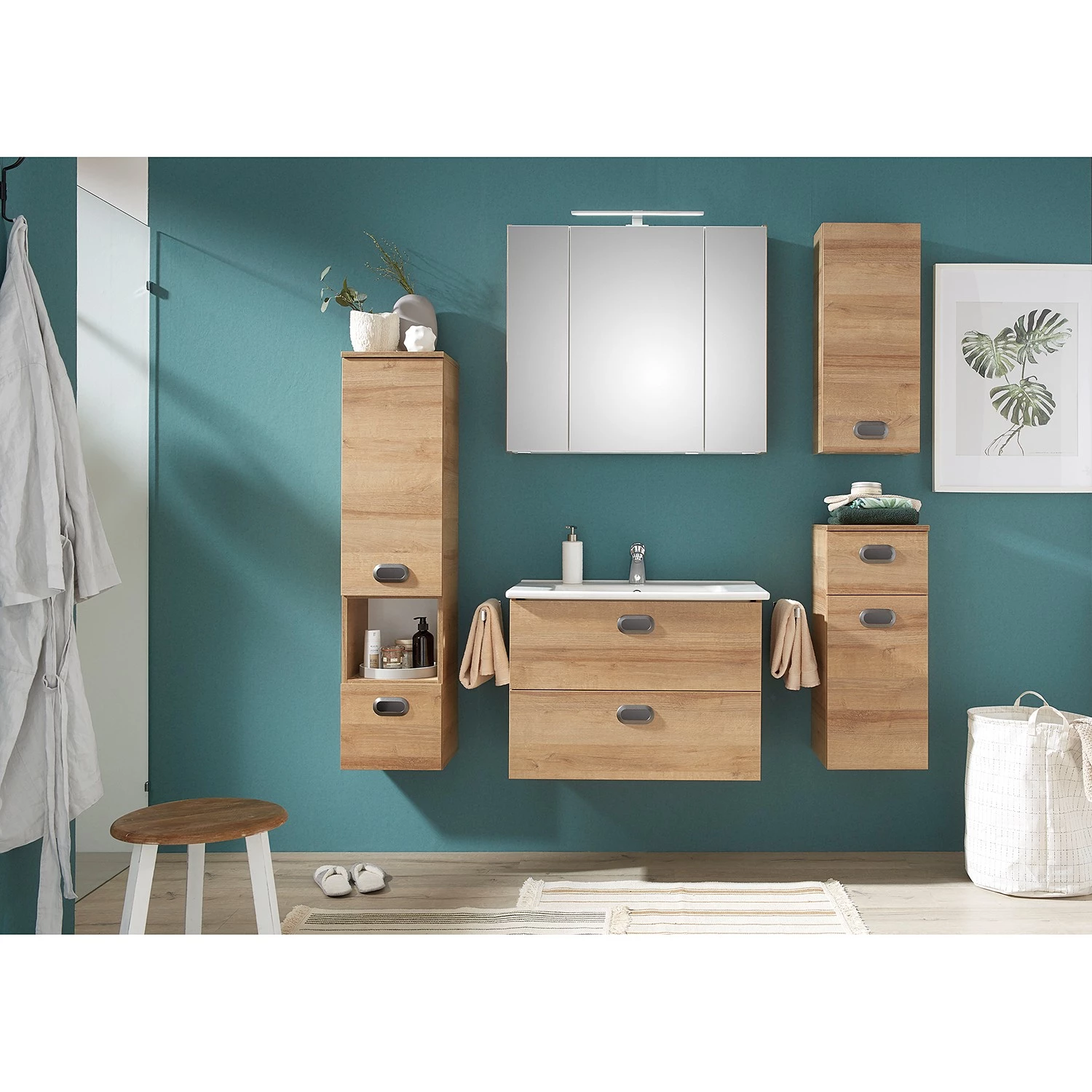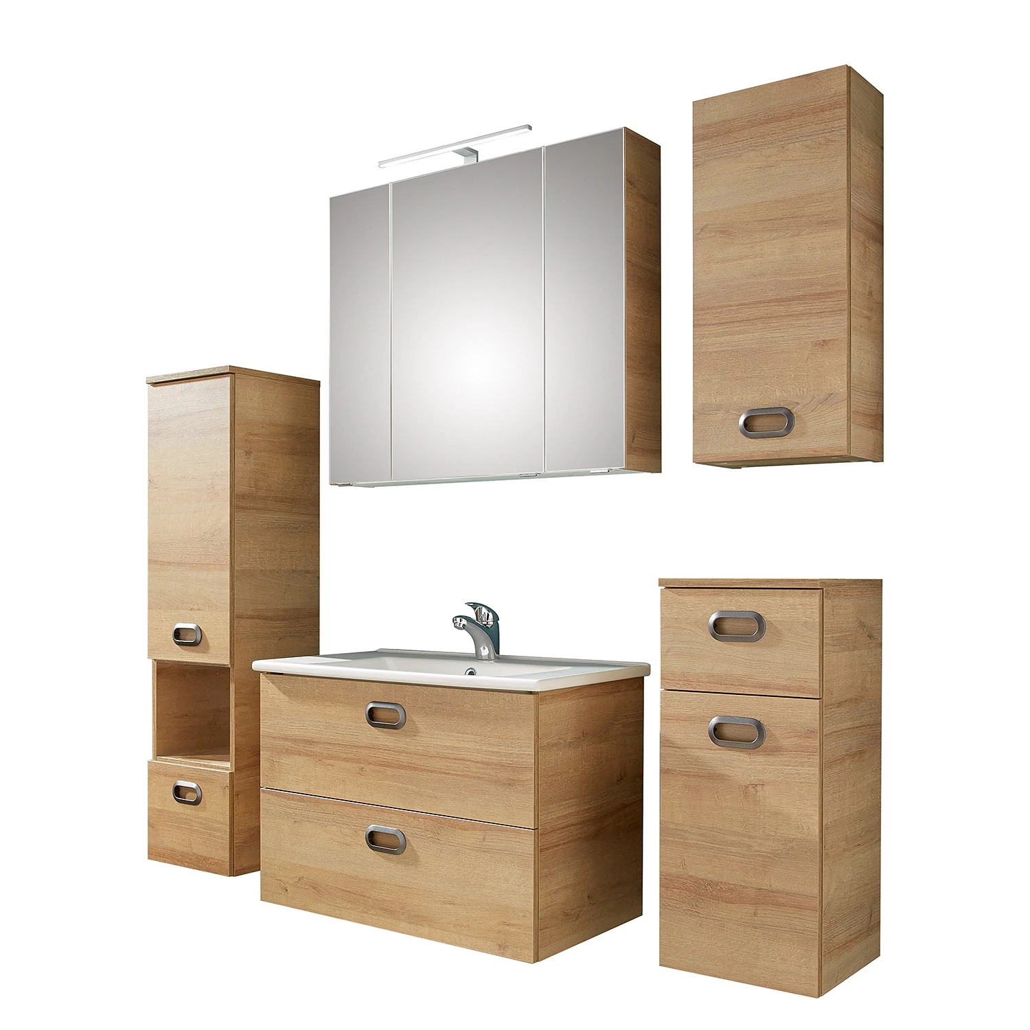 - Contenu de la livraison : Ensemble de salle de bain comprenant 1 meuble avec vasque en céramique, 1 armoire de salle de bain, 1 meuble bas, 1 meuble haut et 1 armoire de toilette avec éclairage