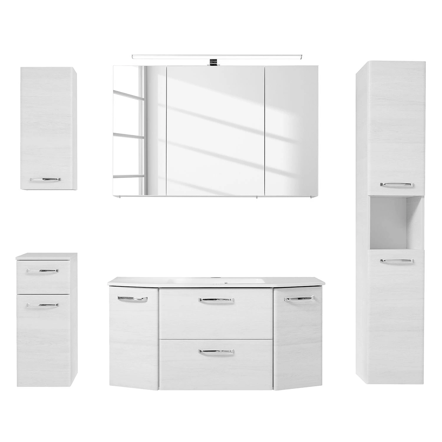 - Contenu de la livraison : 1 meuble haut et 1 meuble bas, 1 armoire de toilette avec éclairage, 1 meuble avec vasque, 1 colonne de salle de bain, sans accessoires