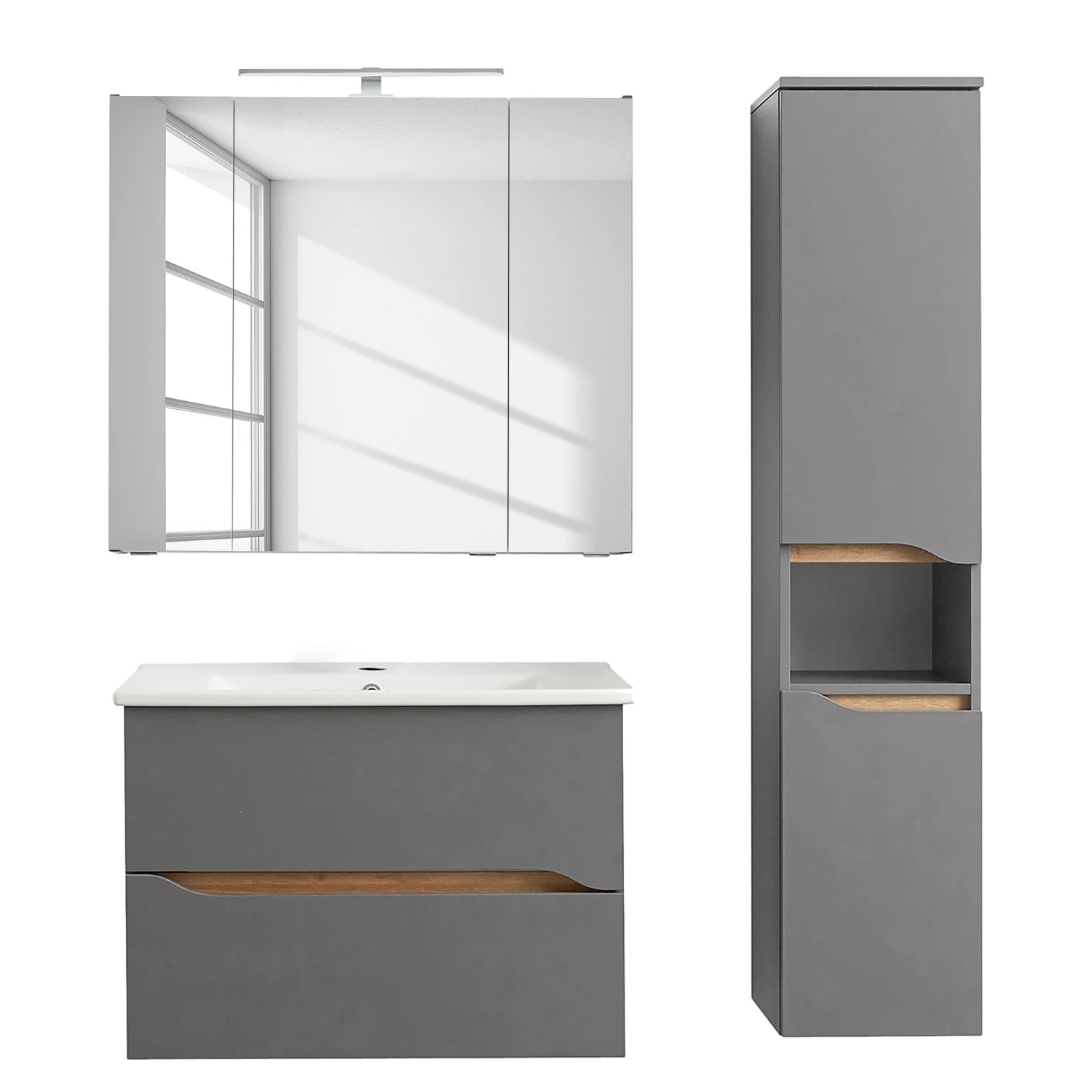 - Contenu de la livraison : Salle de bain comprenant 1 meuble avec vasque en céramique, 1 armoire de salle de bain et 1 armoire de toilette avec éclairage