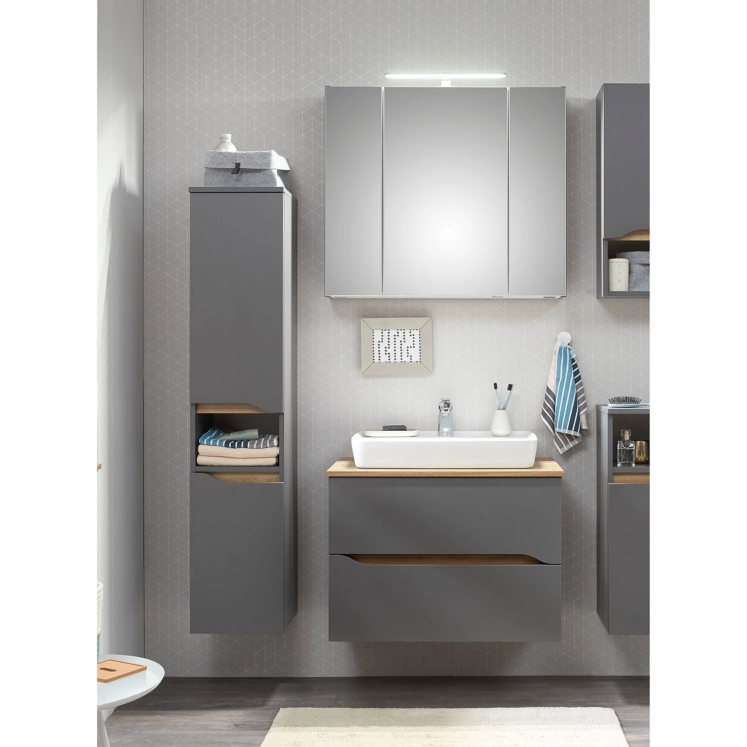 - Contenu de la livraison : Salle de bain comprenant 1 meuble avec vasque en céramique, 1 colonne de salle de bain et 1 armoire de toilette avec éclairage