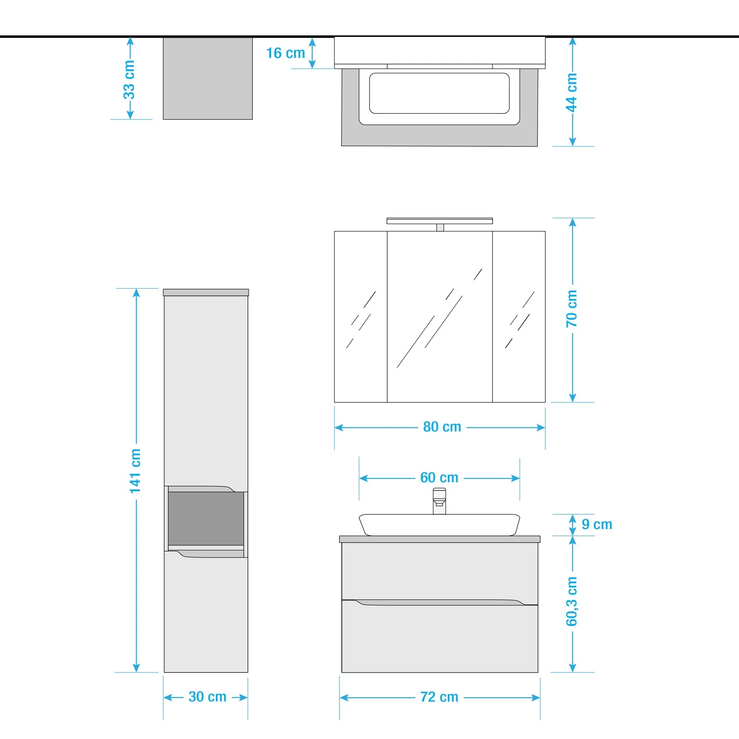 - Armoire de toilette (LxHxP) : 80 x 70 x 16 cm