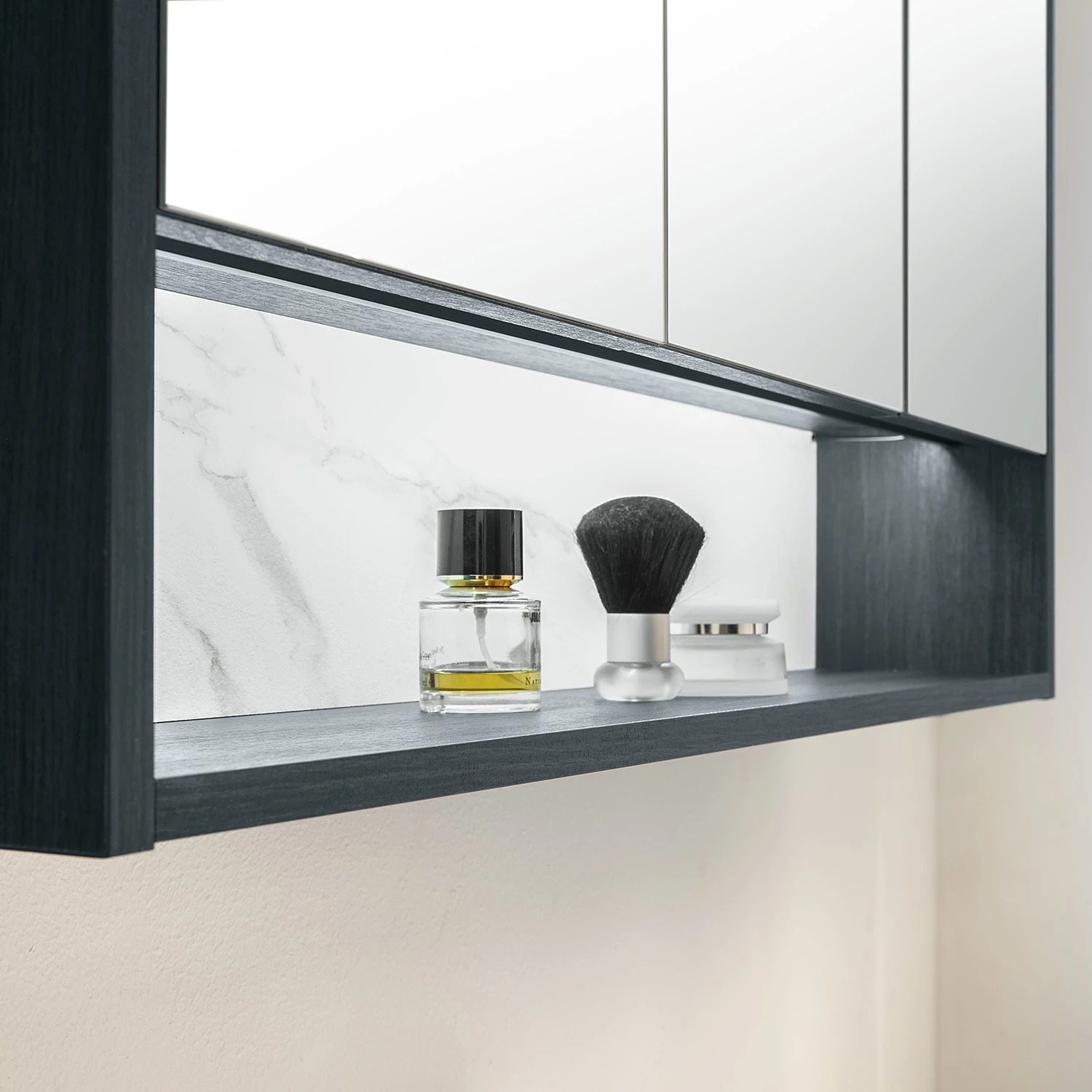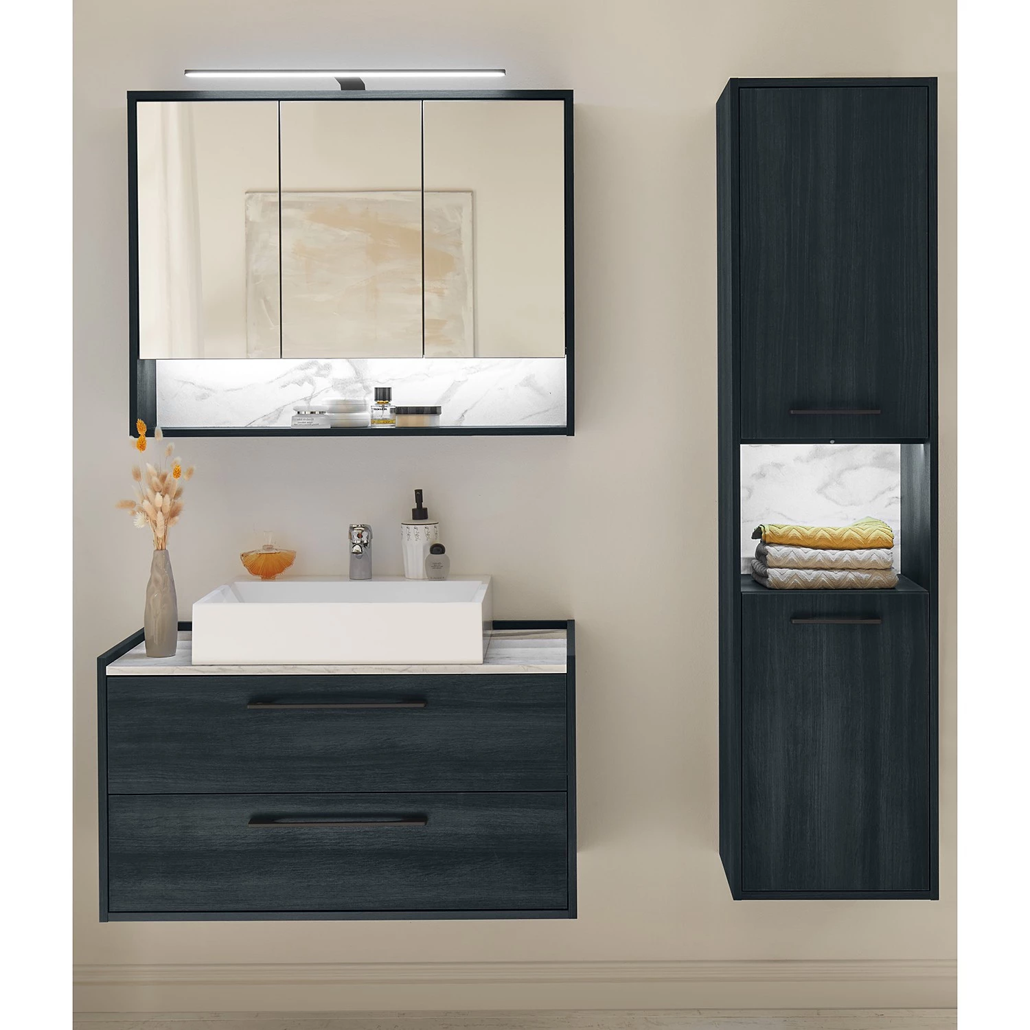 - Contenu de la livraison : Ensemble de salle de bain comprenant 1 colonne de salle de bain avec éclairage, 1 meuble avec vasque en fonte minérale et 1 armoire de toilette avec éclairage