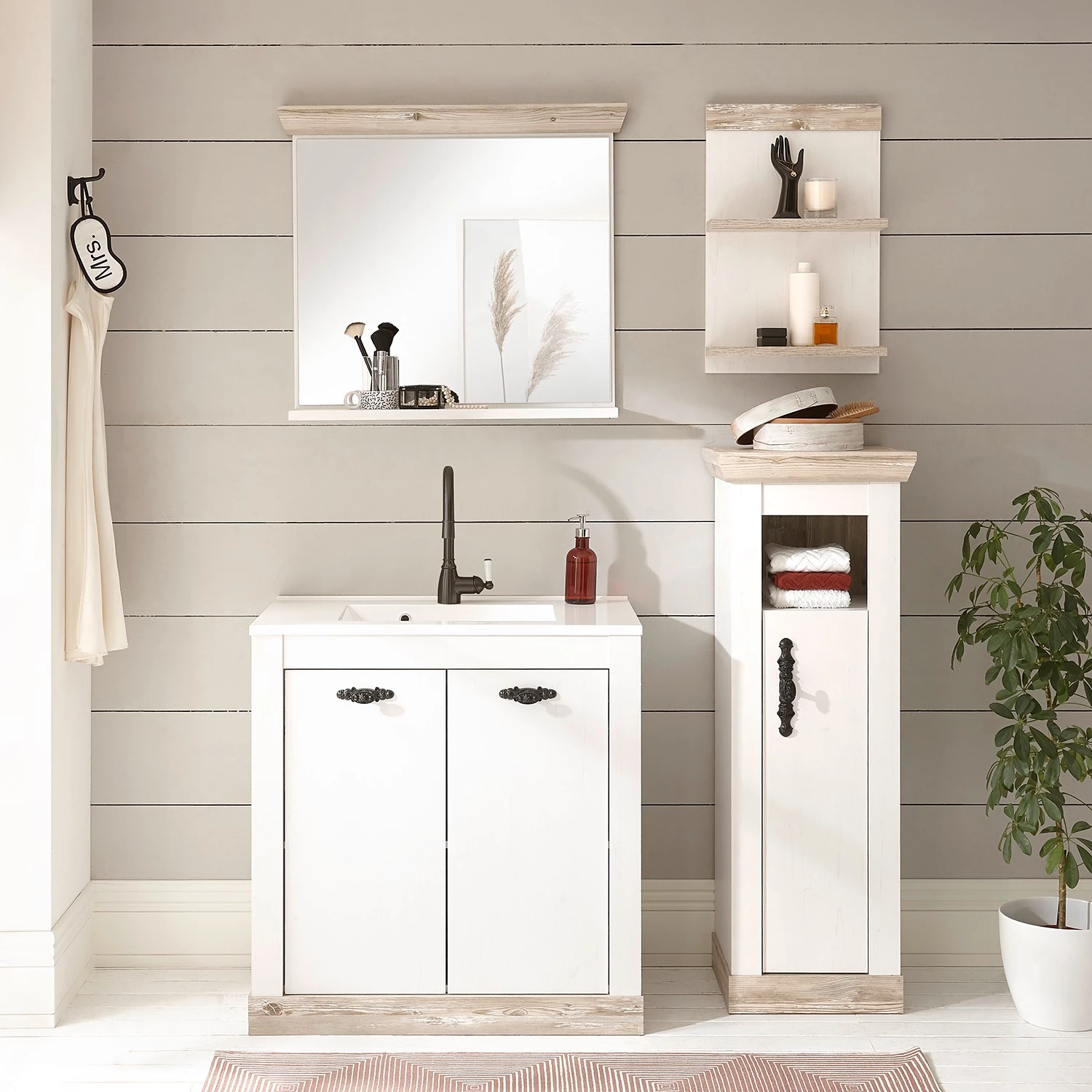 - Contenu de la livraison : Ensemble de salle de bain comprenant 1 meuble avec vasque en fonte minérale, 1 armoire de salle de bain, 1 étagère murale et 1 miroir