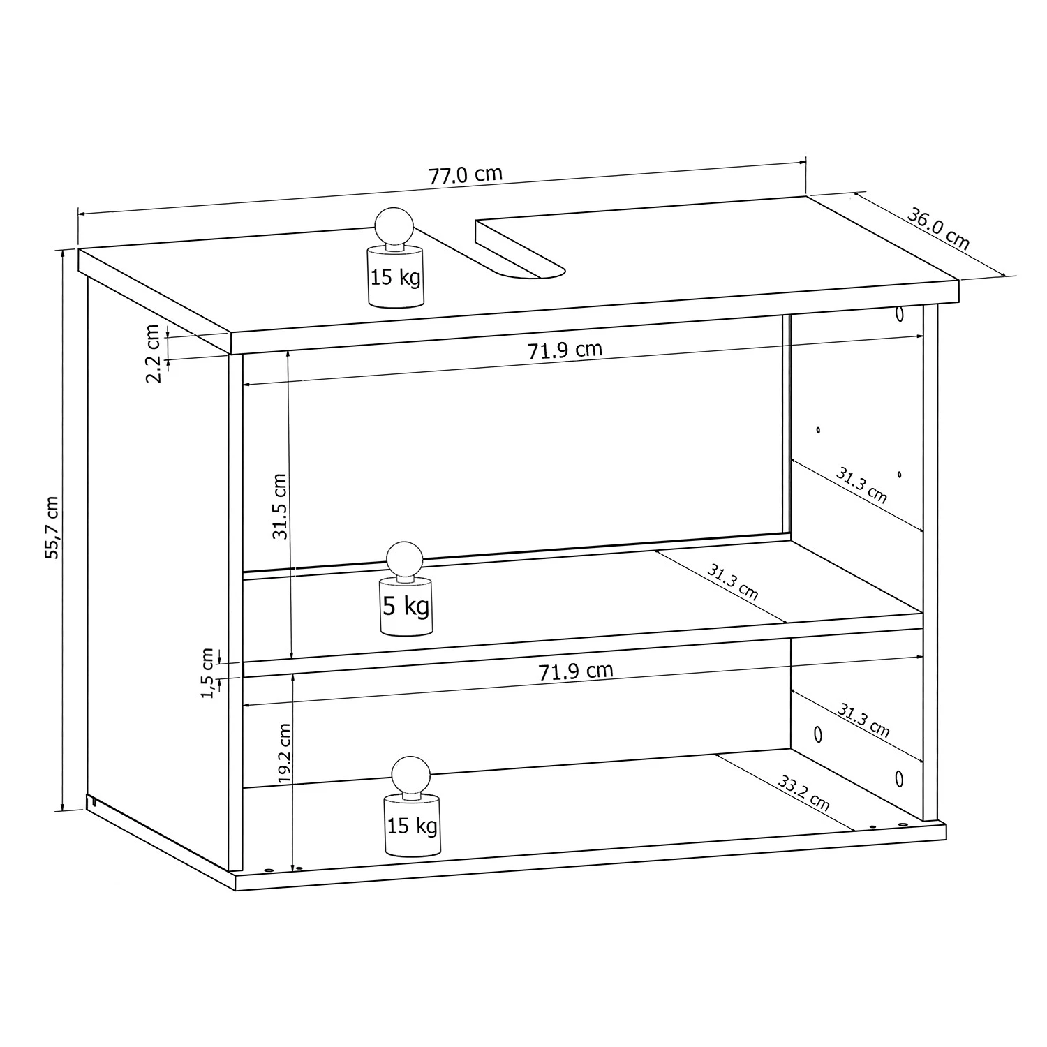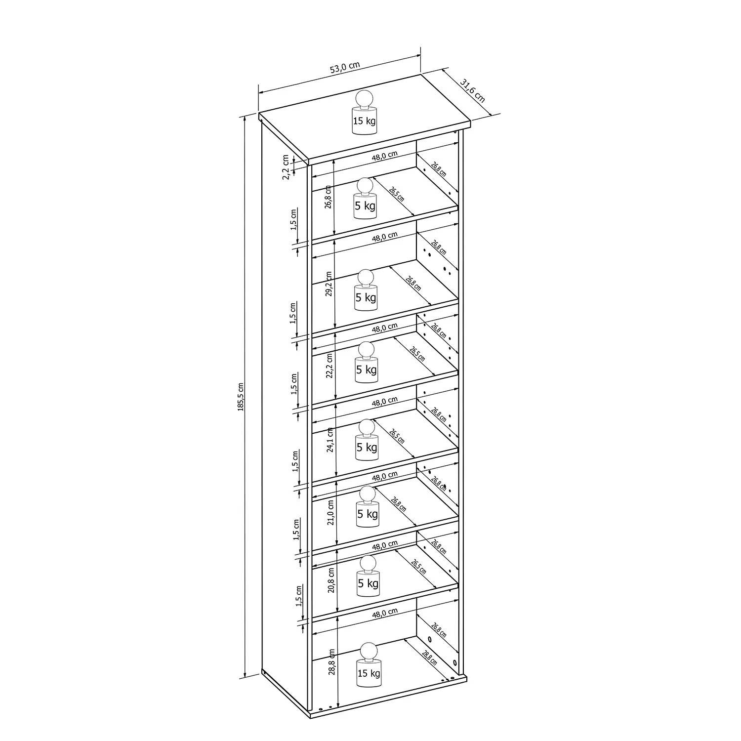 - Charge maximale des étagères : 5 kg