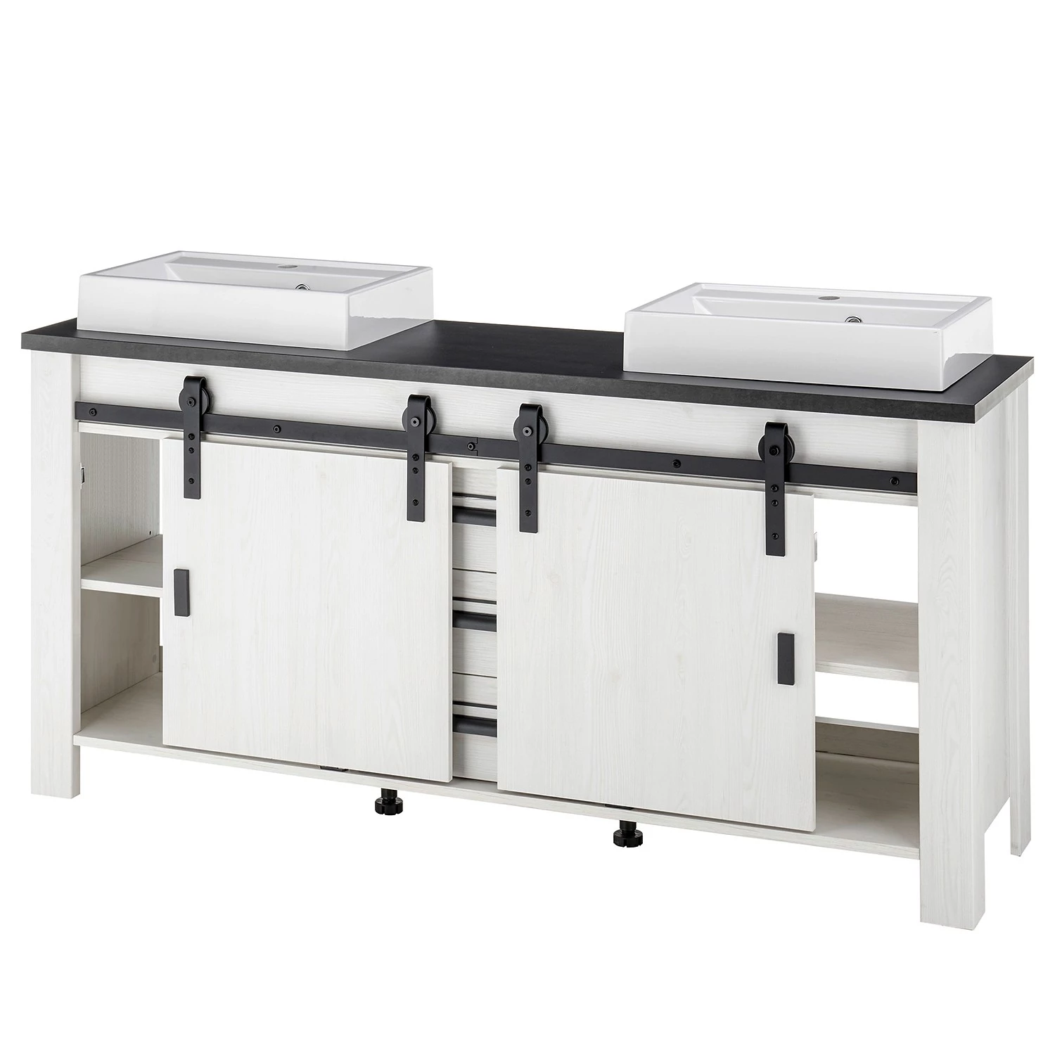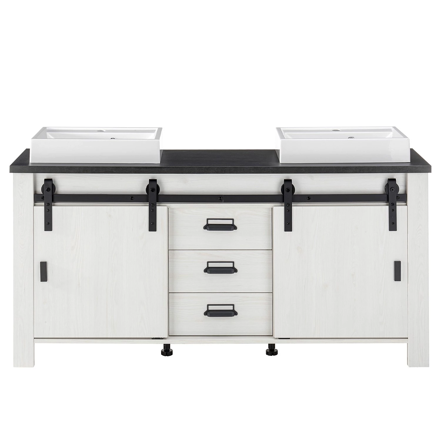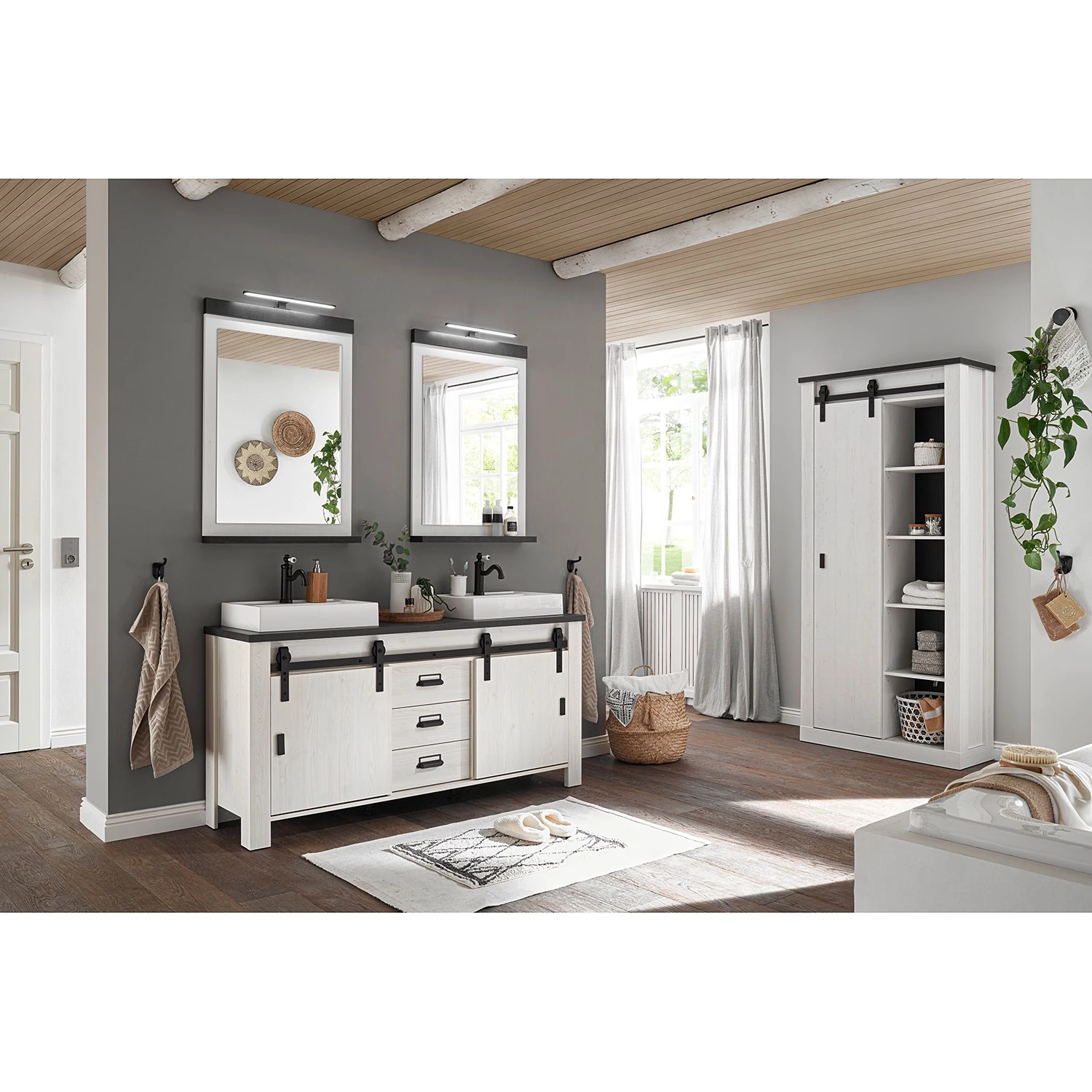 - Contenu de la livraison : Salle de bain comprenant 1 armoire, 2 miroirs et 1 meuble avec vasque en fonte minérale, avec éclairage et sans accessoires