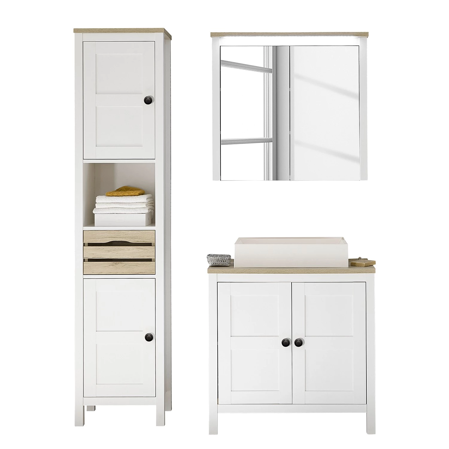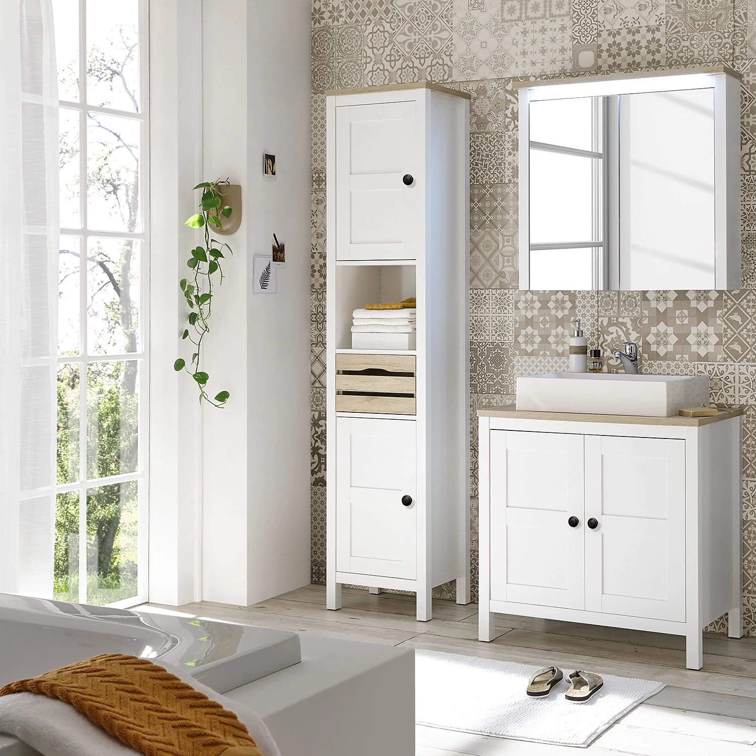 - Contenu de la livraison : Salle de bain comprenant 1 meuble avec vasque en céramique, 1 colonne de salle de bain et 1 armoire de toilette avec éclairage