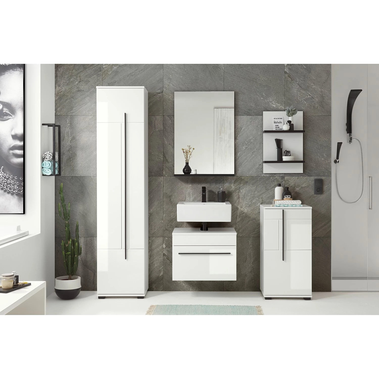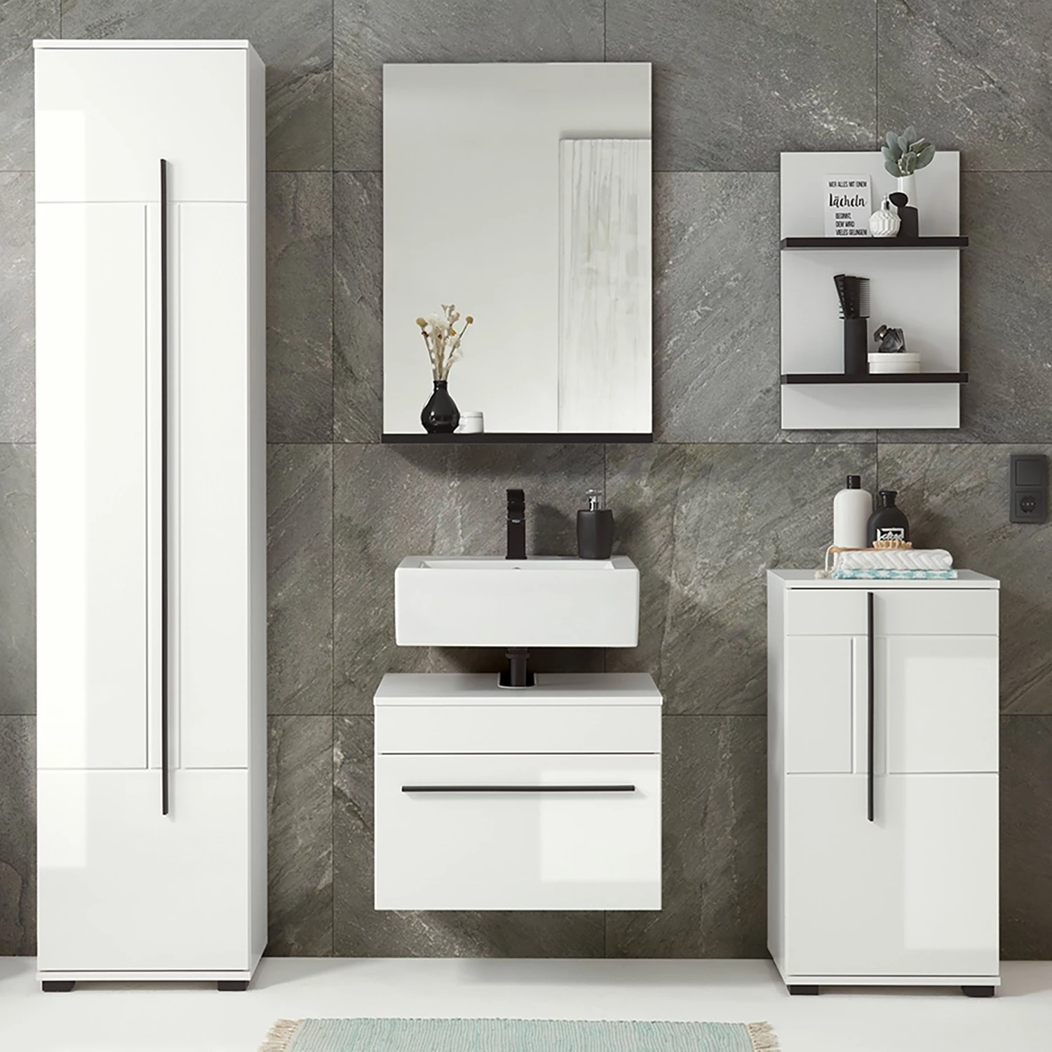 - Contenu de la livraison : Salle de bain comprenant 1 meuble sous vasque, 1 colonne de salle de bain (charnières à gauche), 1 meuble bas (charnières à droite), 1 étagère murale et 1 miroir