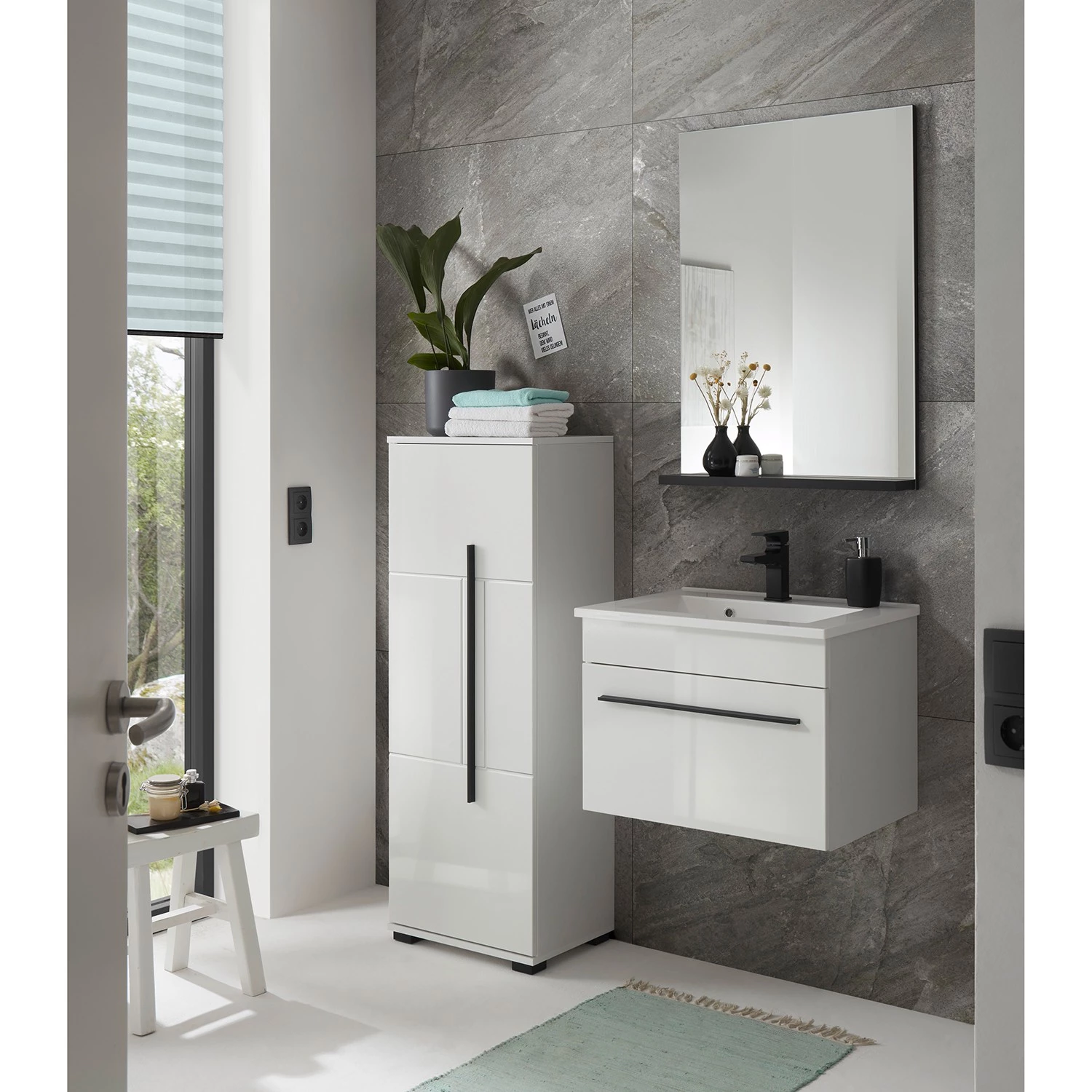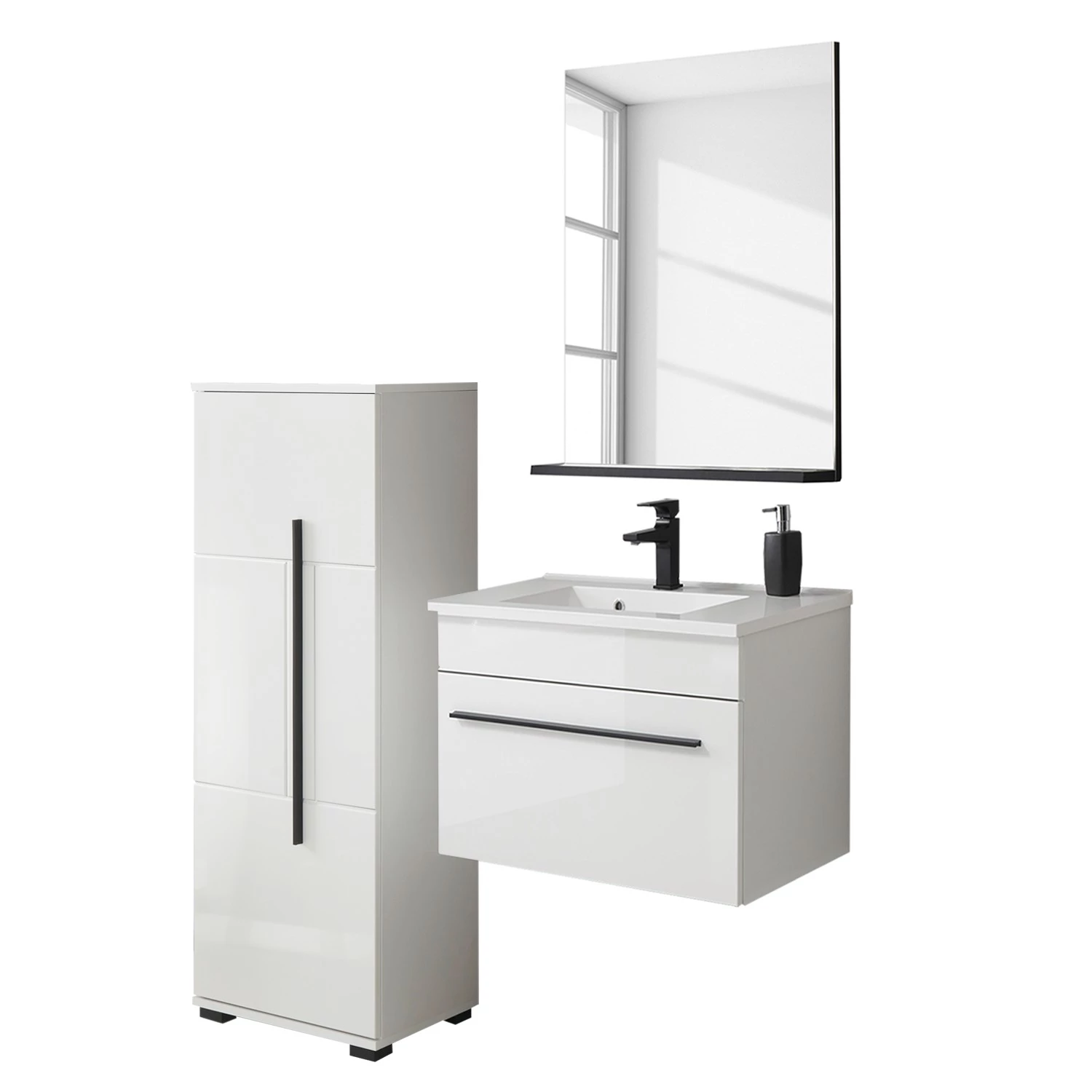 - Contenu de la livraison : Salle de bain comprenant 1 meuble avec vasque en fonte minérale, 1 armoire de salle de bain (avec charnière à gauche) et 1 miroir