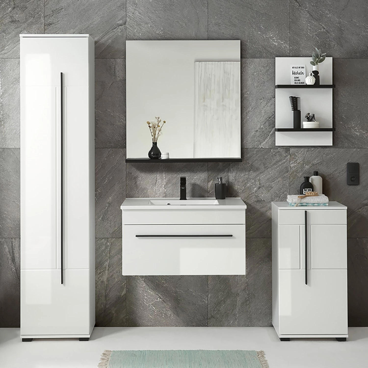 - Contenu de la livraison : Salle de bain comprenant 1 meuble avec vasque en fonte minérale, 1 colonne de salle de bain (charnières à gauche), 1 meuble bas (charnières à droite), 1 étagère murale et 1 miroir