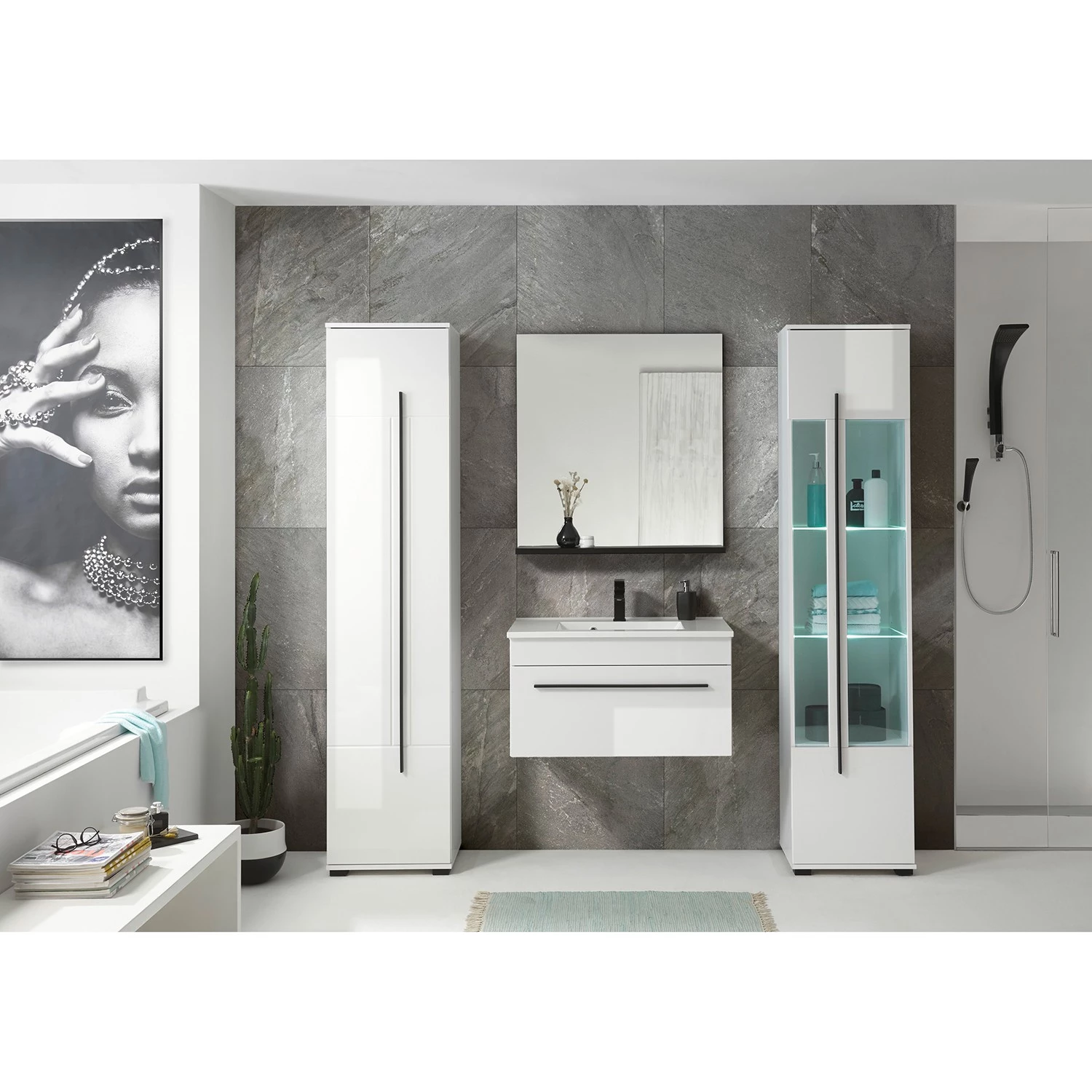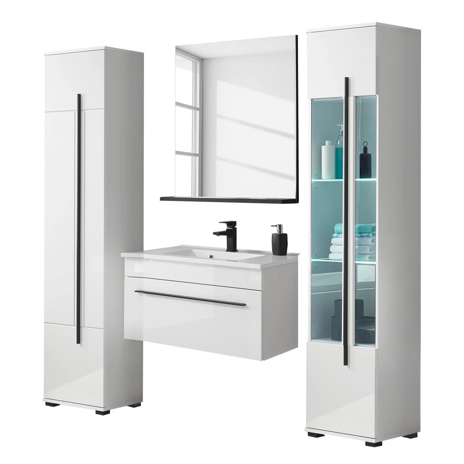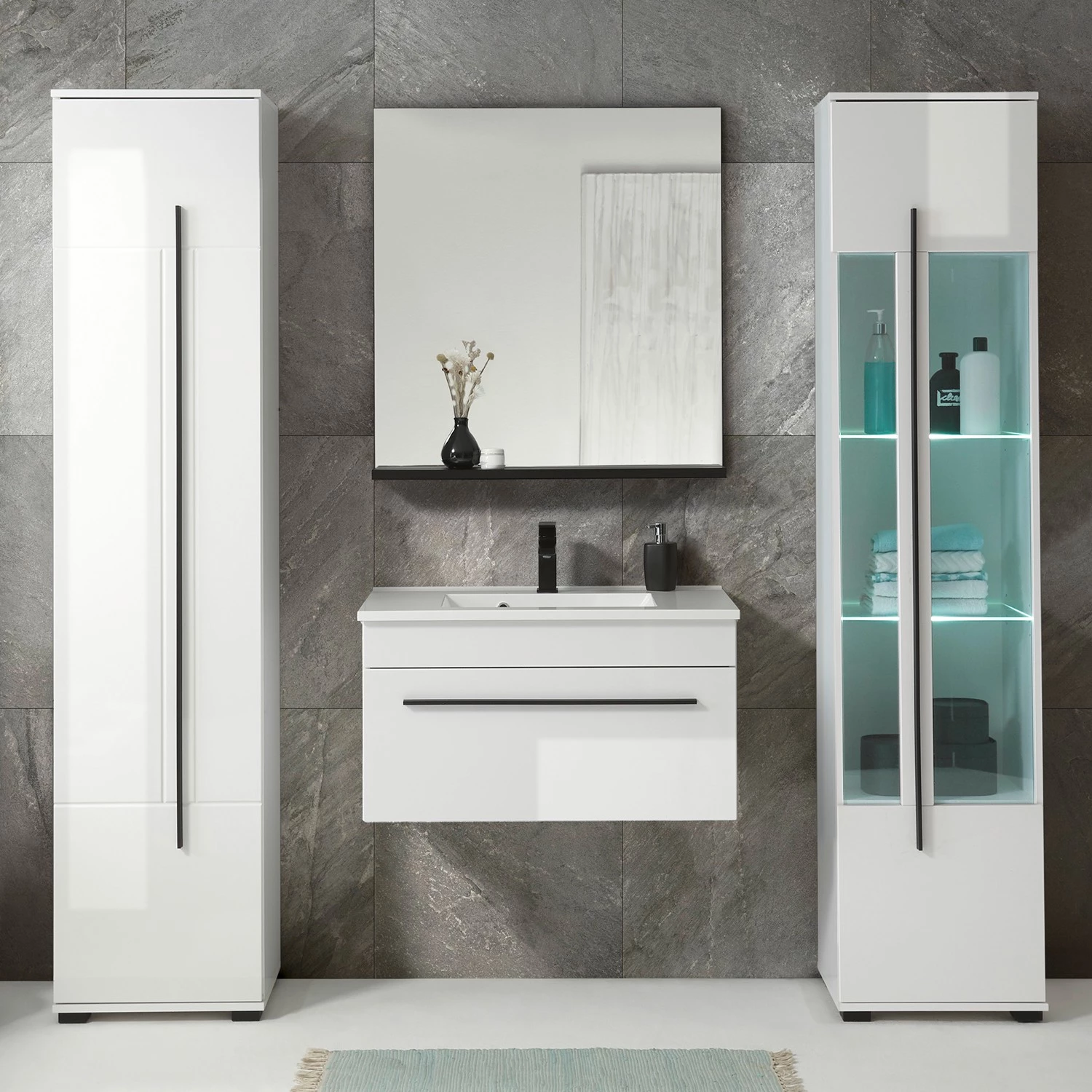 - Contenu de la livraison : Salle de bain comprenant 1 meuble avec vasque en fonte minérale, 1 colonne de salle de bain (charnières à gauche), 1 colonne de salle de bain (charnières à droite) et 1 miroir