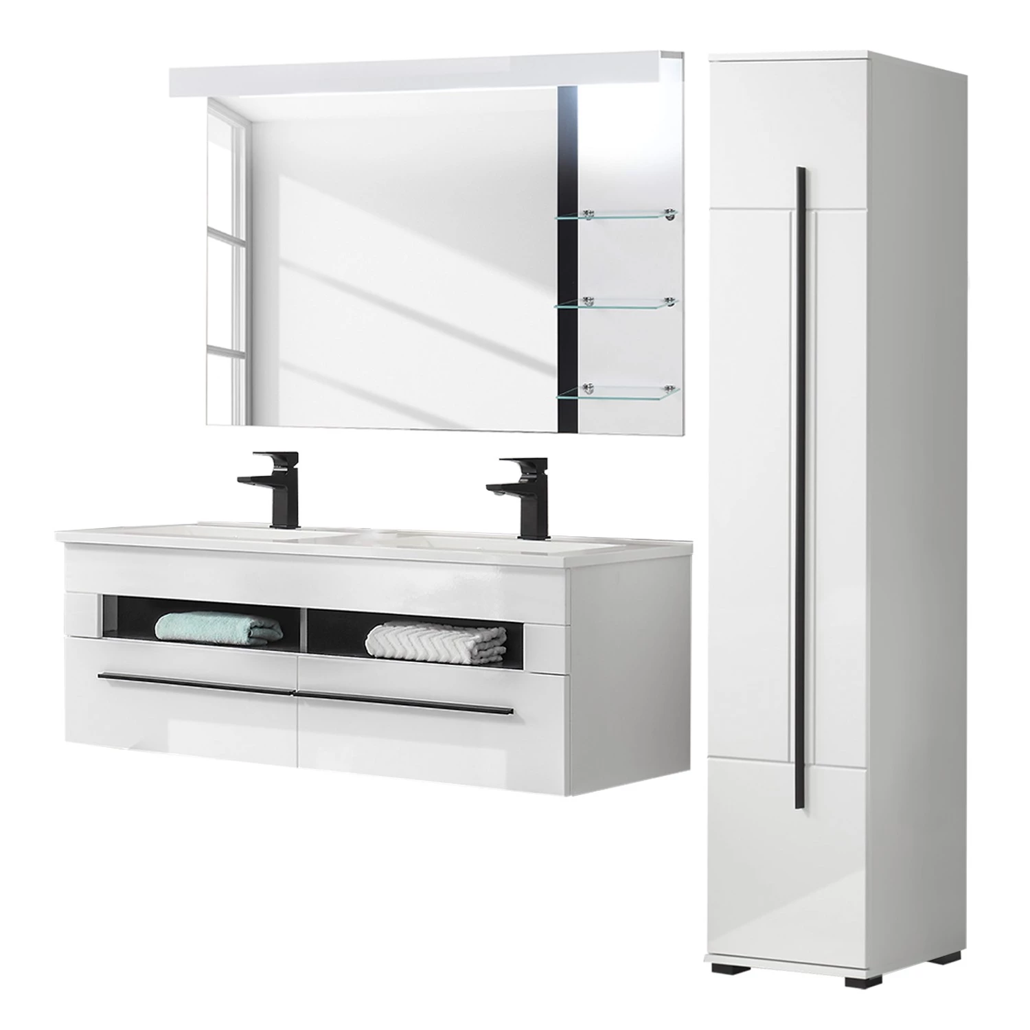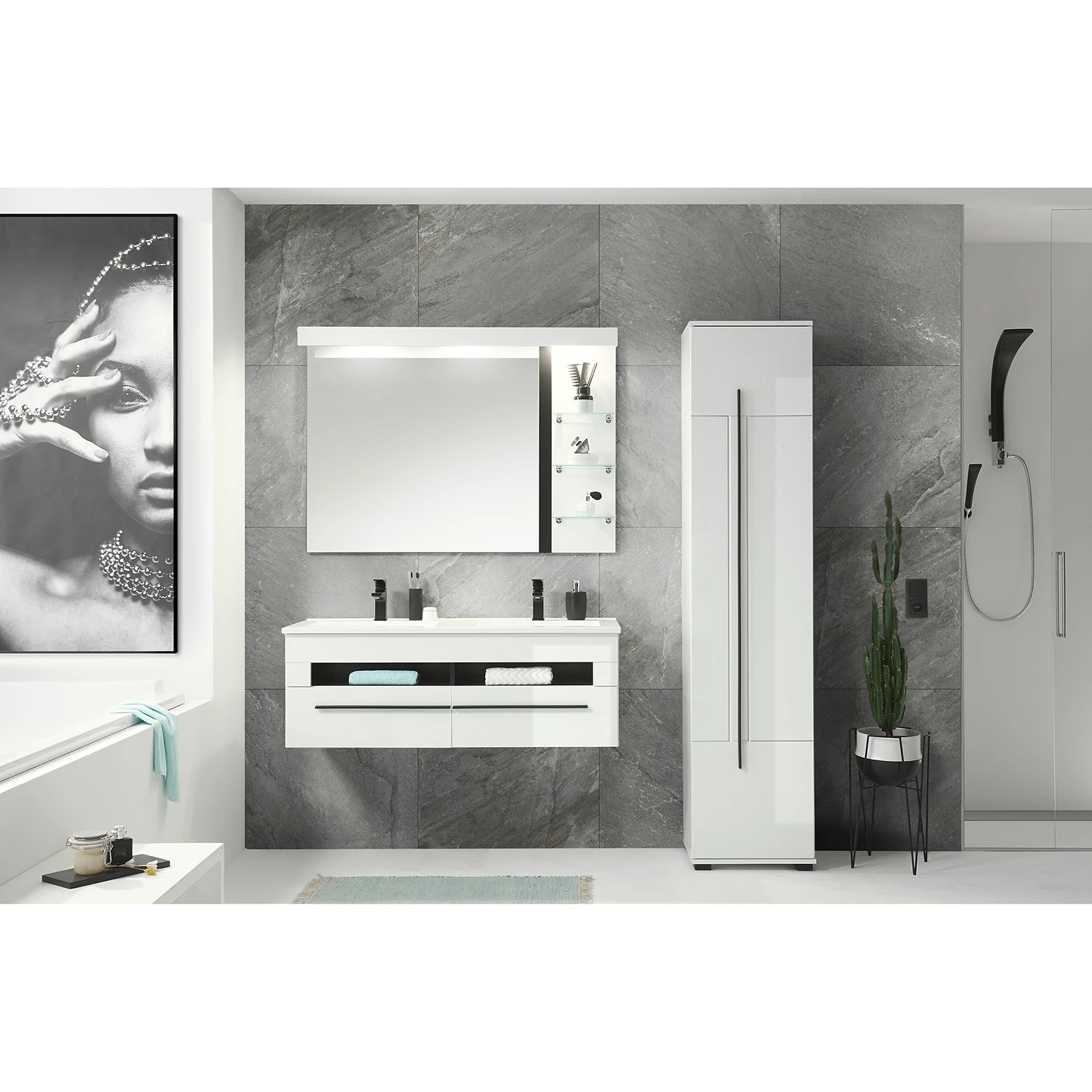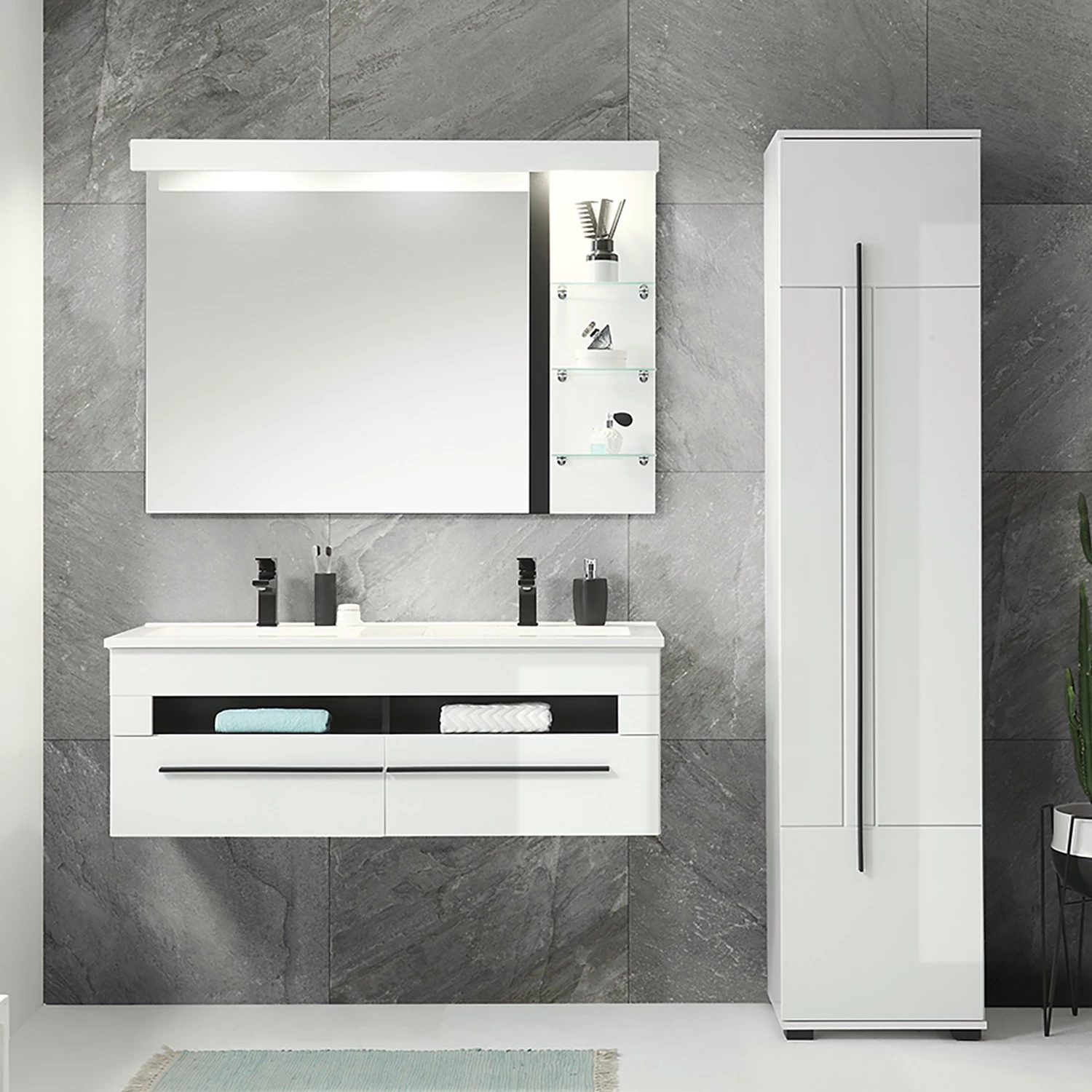 - Contenu de la livraison : Salle de bain comprenant 1 meuble double avec 2 vasques en fonte minérale, 1 colonne de salle de bain (charnières à droite) et 1 miroir avec éclairage LED