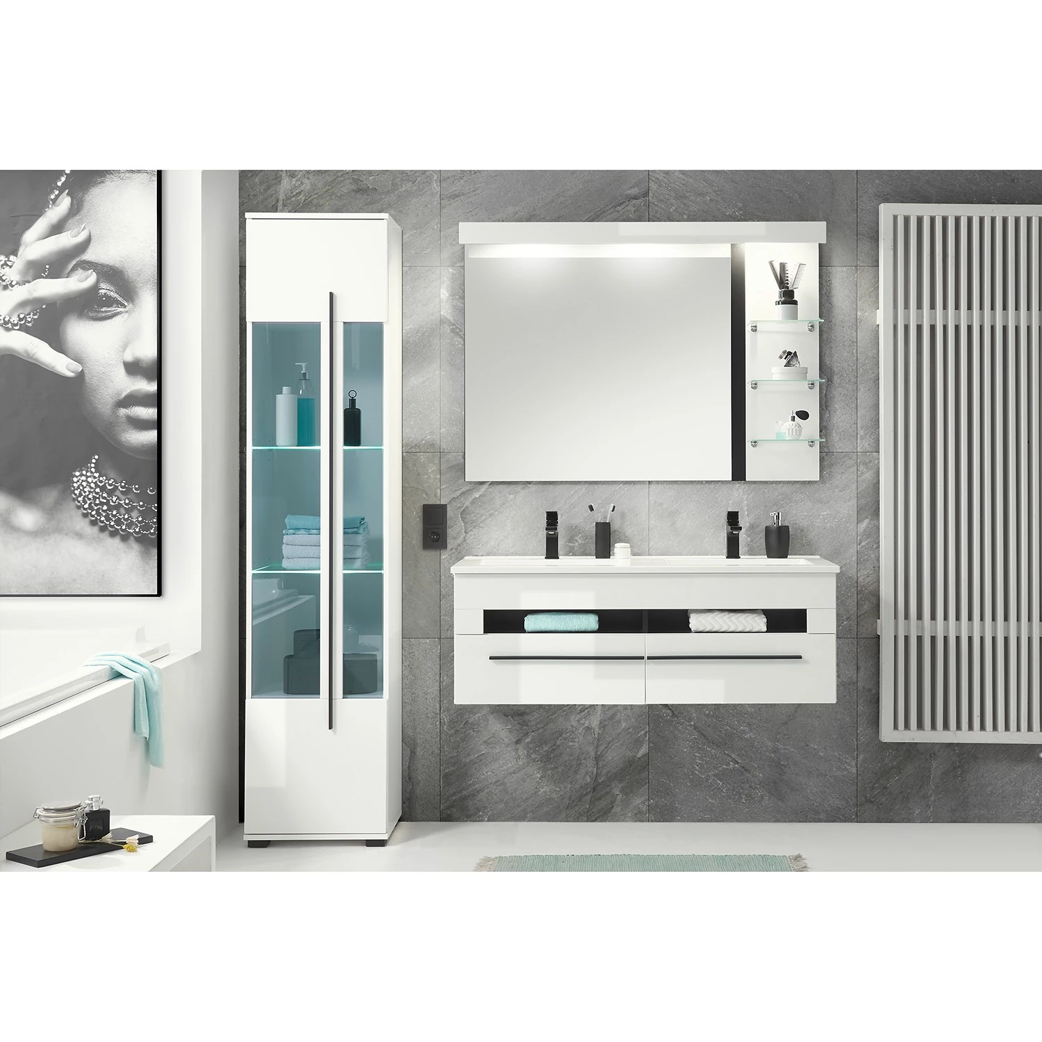 - Contenu de la livraison : Salle de bain comprenant 1 meuble double avec 2 vasques en fonte minérale, 1 colonne de salle de bain (charnières à gauche) et 1 miroir avec éclairage LED