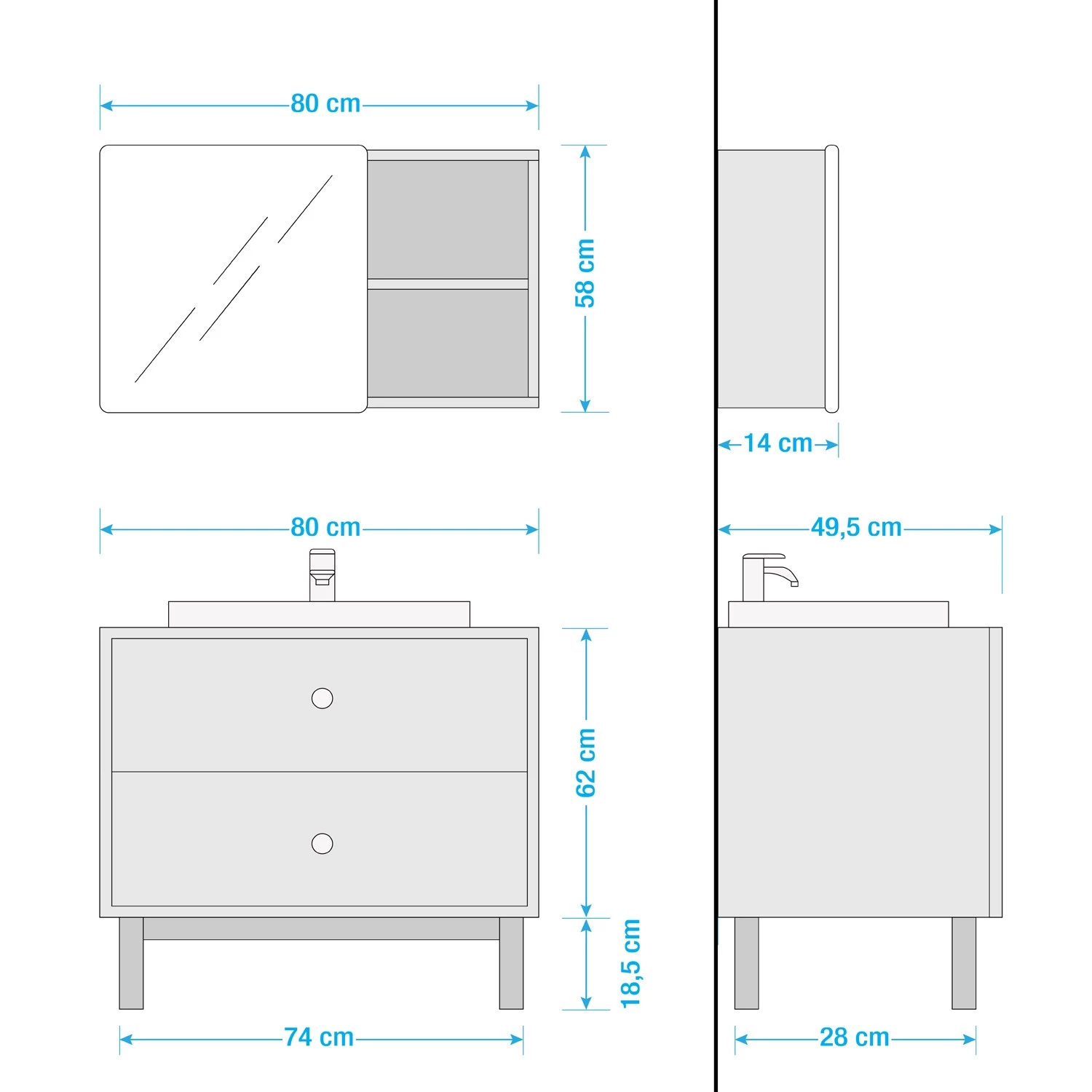 - Armoire de toilette (LxHxP) : 80 x 58 x 14 cm