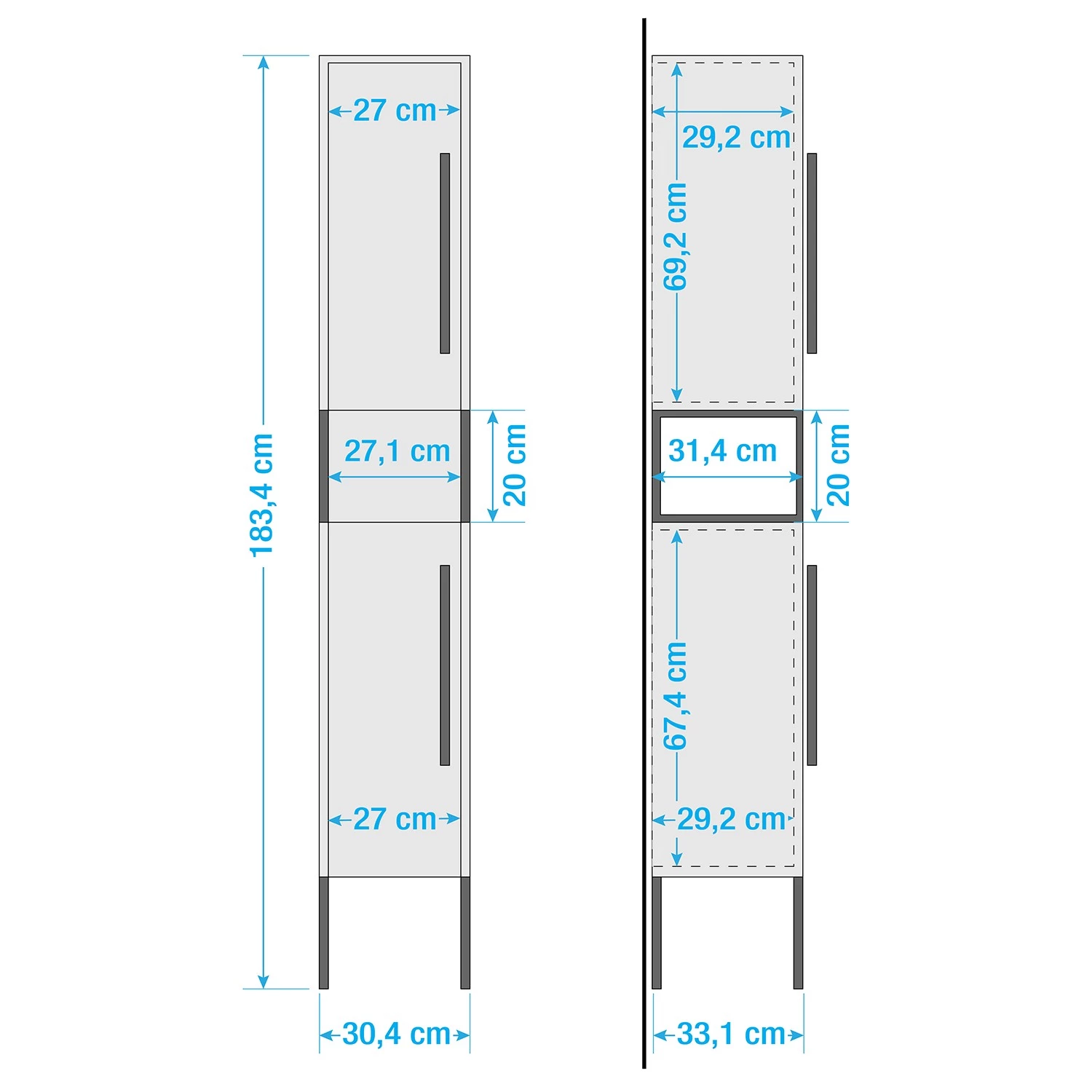 - Dimensions derrière la porte inférieure (LxHxP) : 27 x 67,4 x 29,2 cm