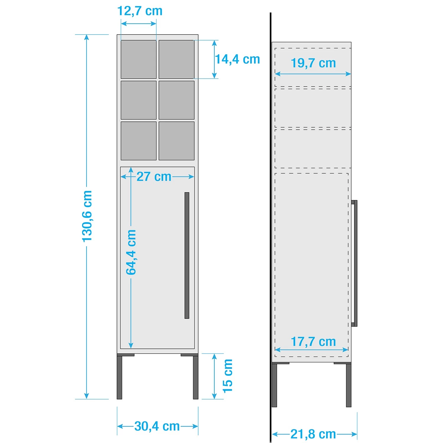 - Dimensions intérieures derrière de la porte (LxHxP) : 27 x 64,4 x 17,7 cm