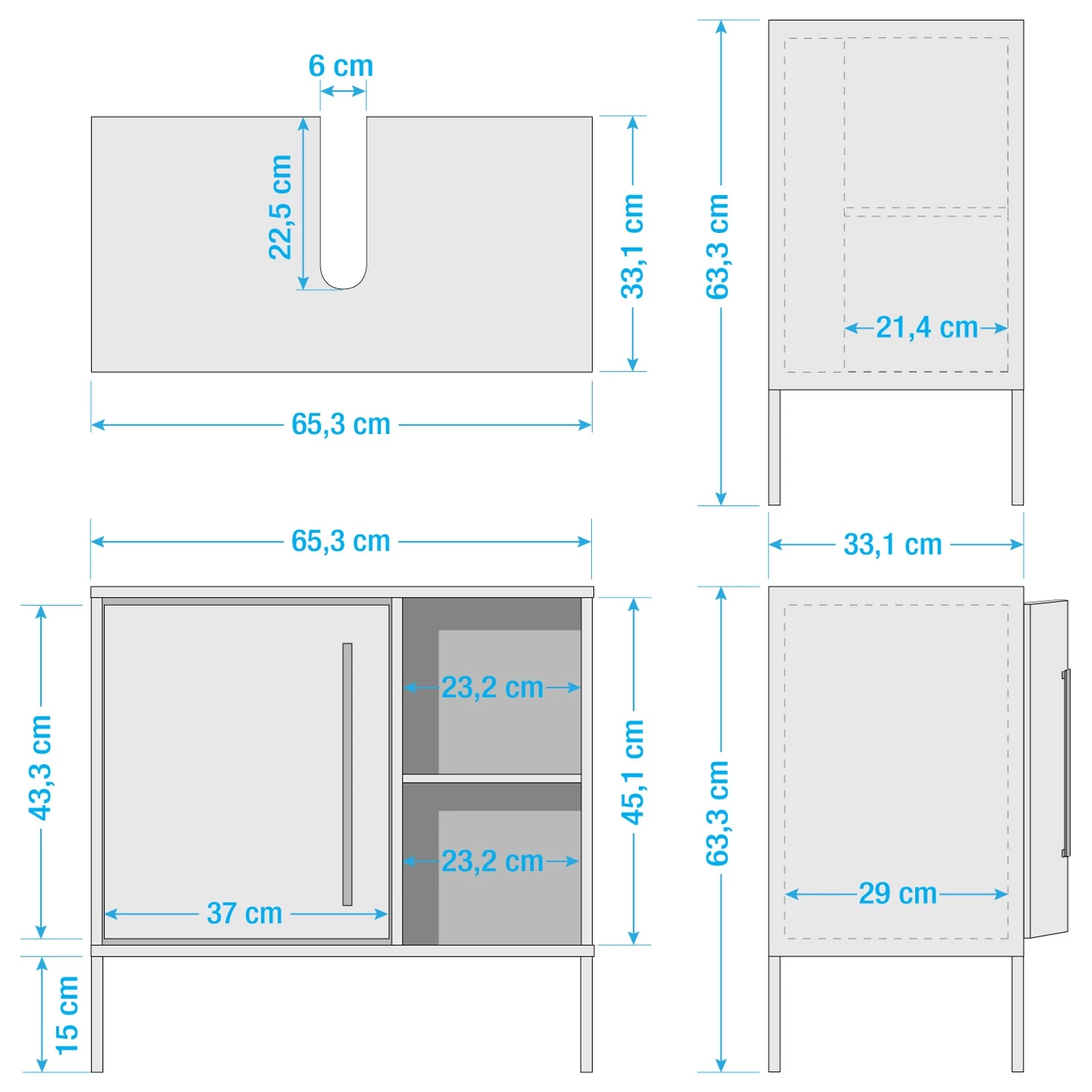 - Découpe pour siphon (L x P) : 6 x 22,5 cm