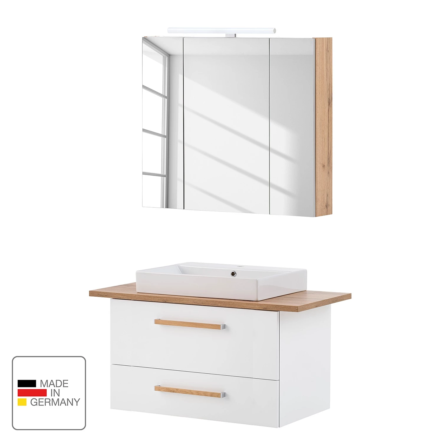 - Contenu de la livraison : Salle de bain comprenant 1 meuble avec vasque en céramique et 1 armoire de toilette avec éclairage