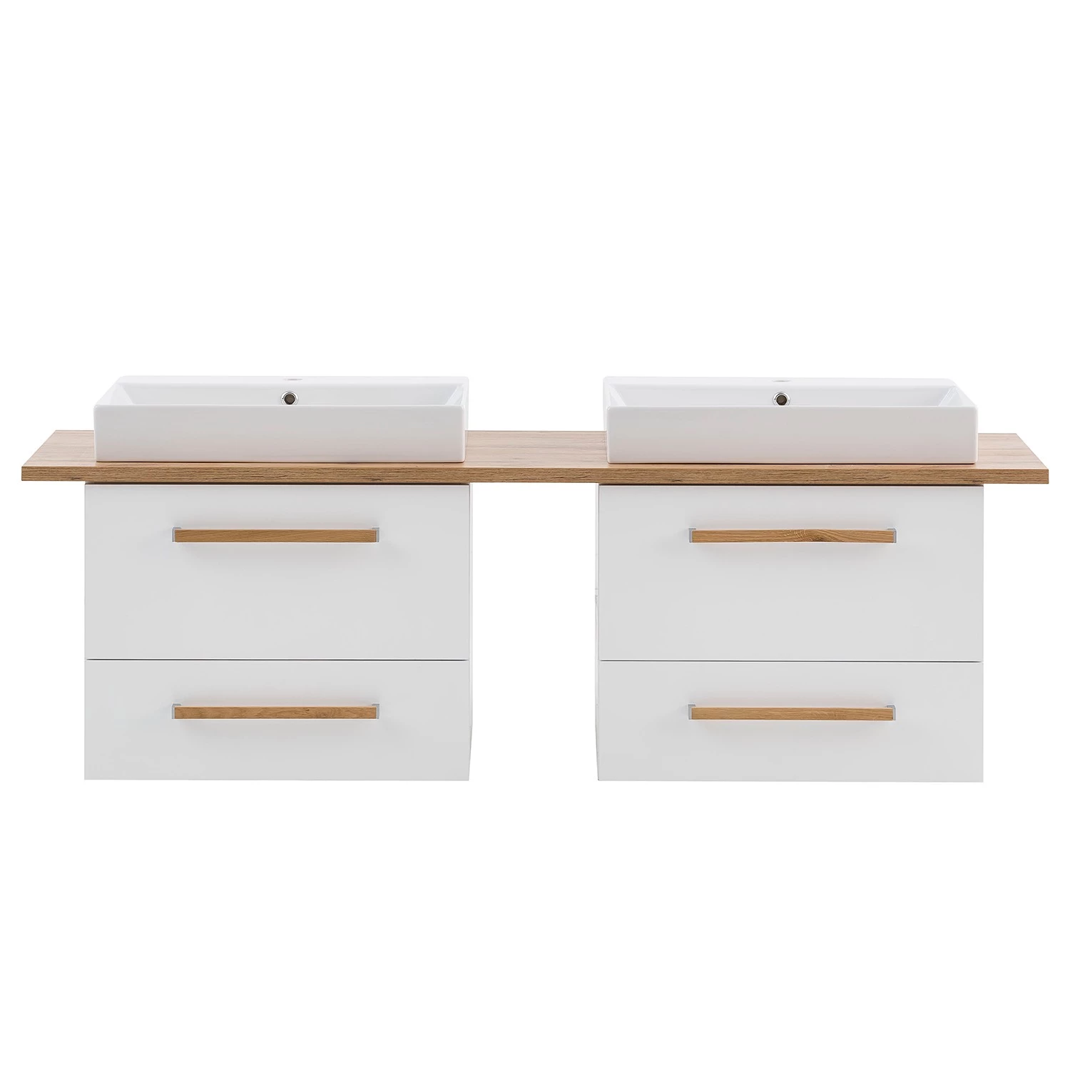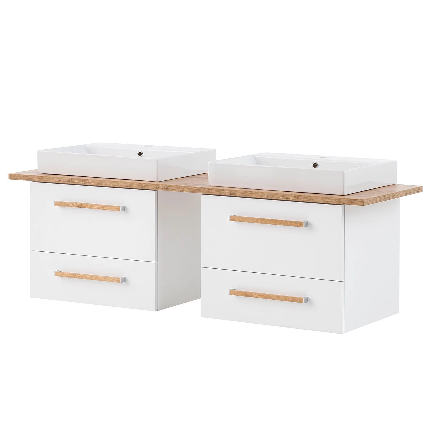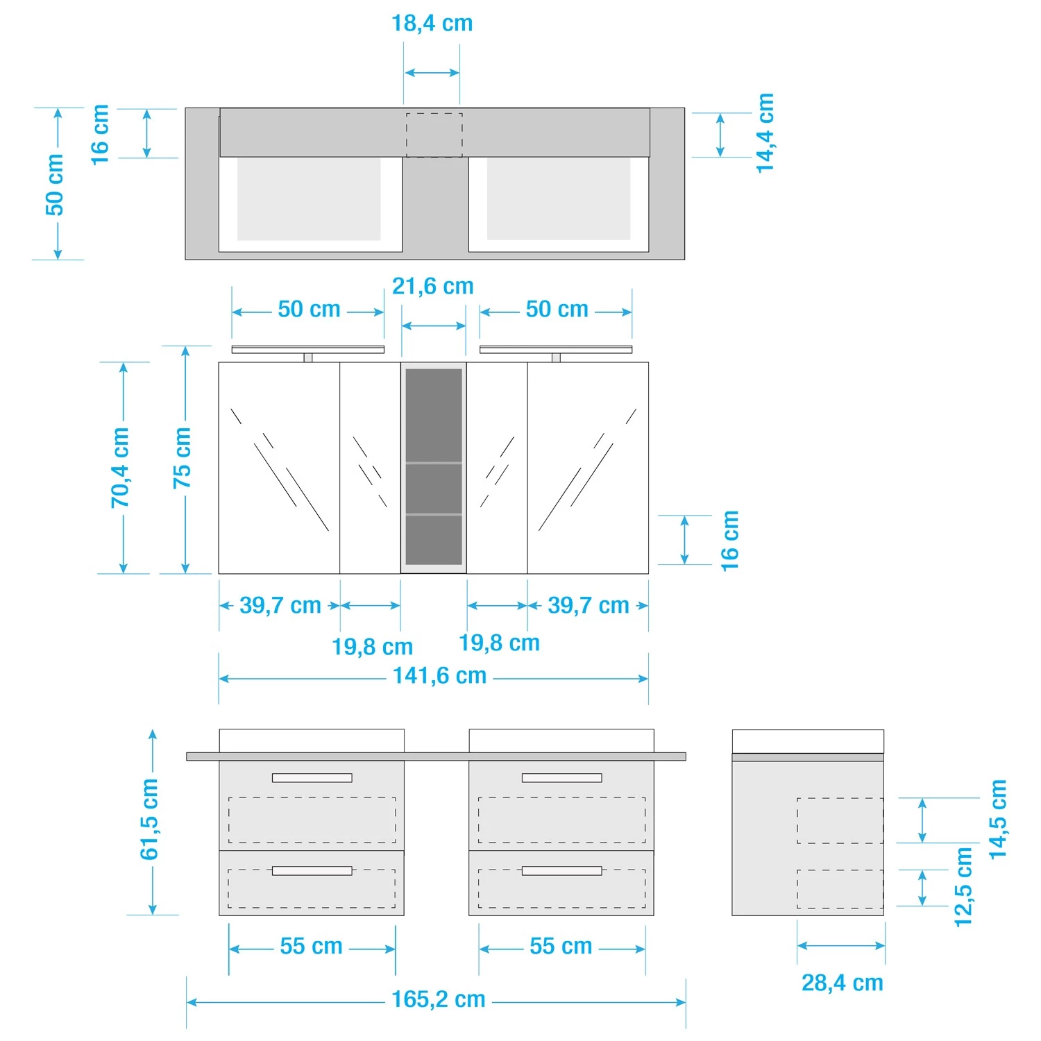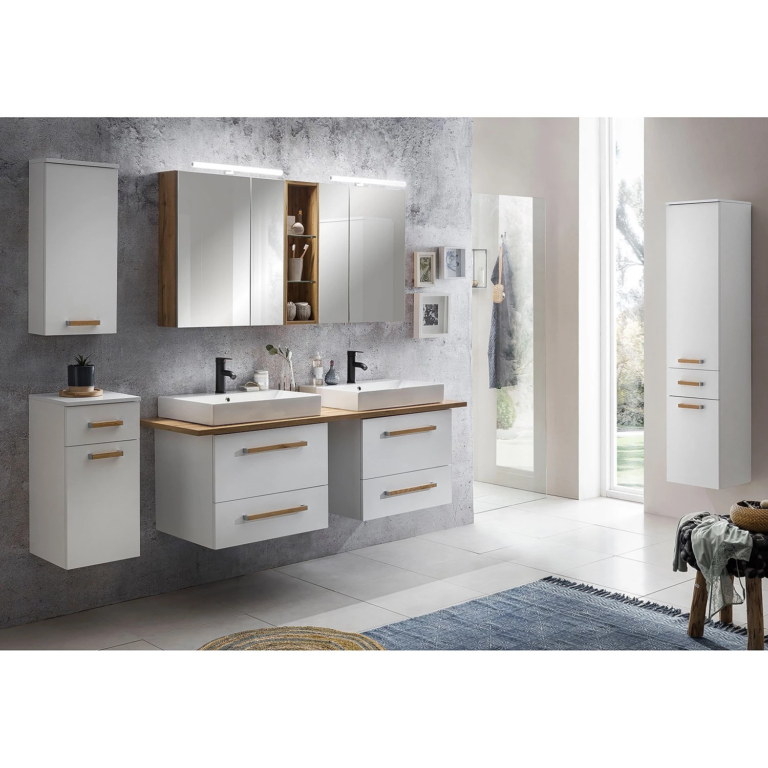 - Contenu de la livraison : Salle de bain comprenant 1 meuble avec deux vasques en céramique, 1 étagère et 2 armoires de toilette avec éclairage