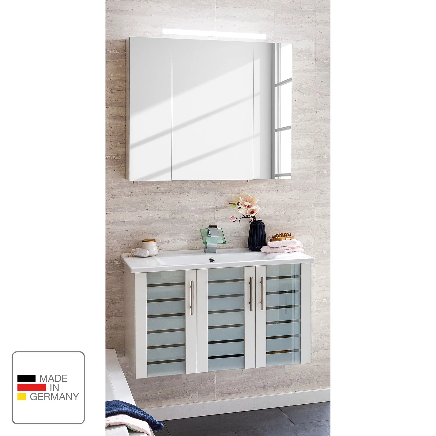 - Contenu de la livraison : Salle de bain comprenant 1 meuble avec vasque, 1 armoire de toilette avec éclairage et combinaison interrupteur / prise
