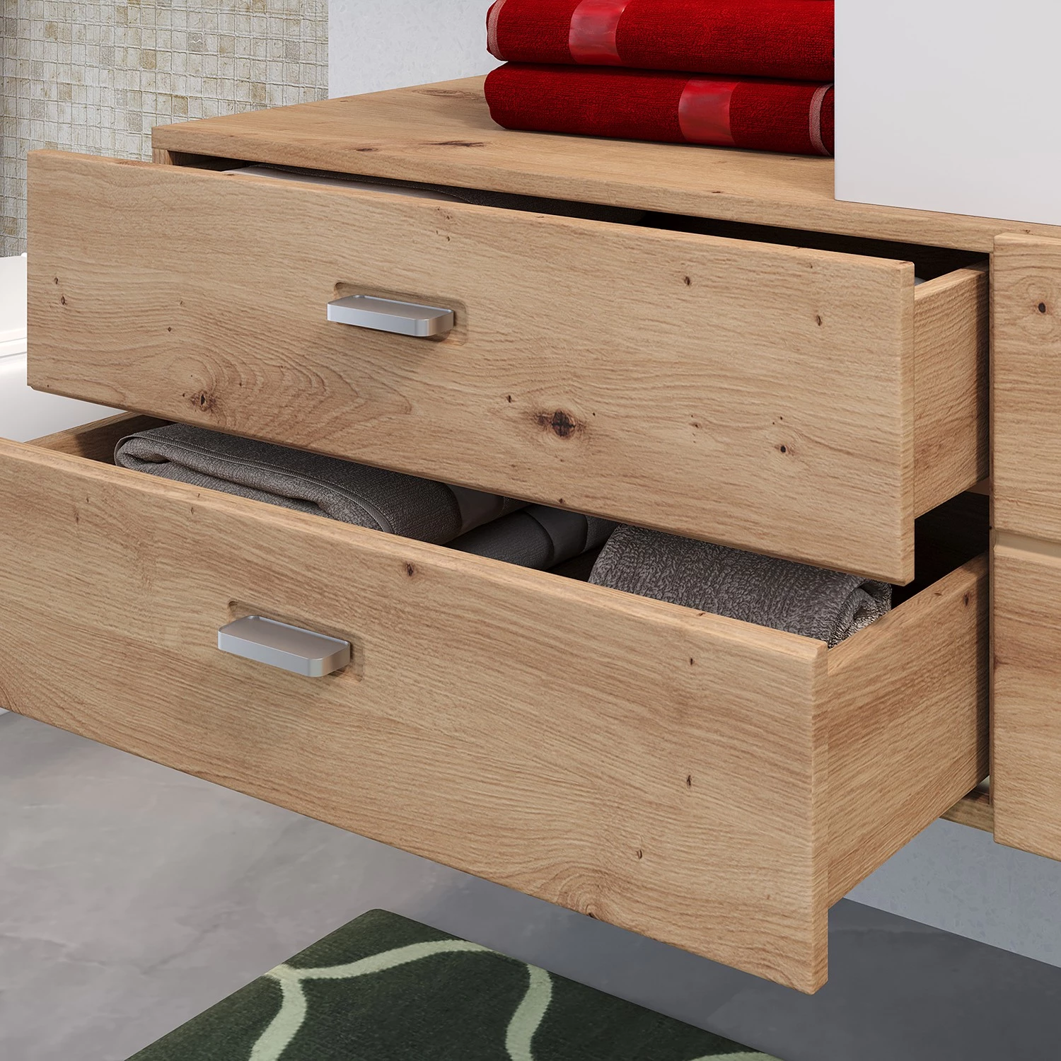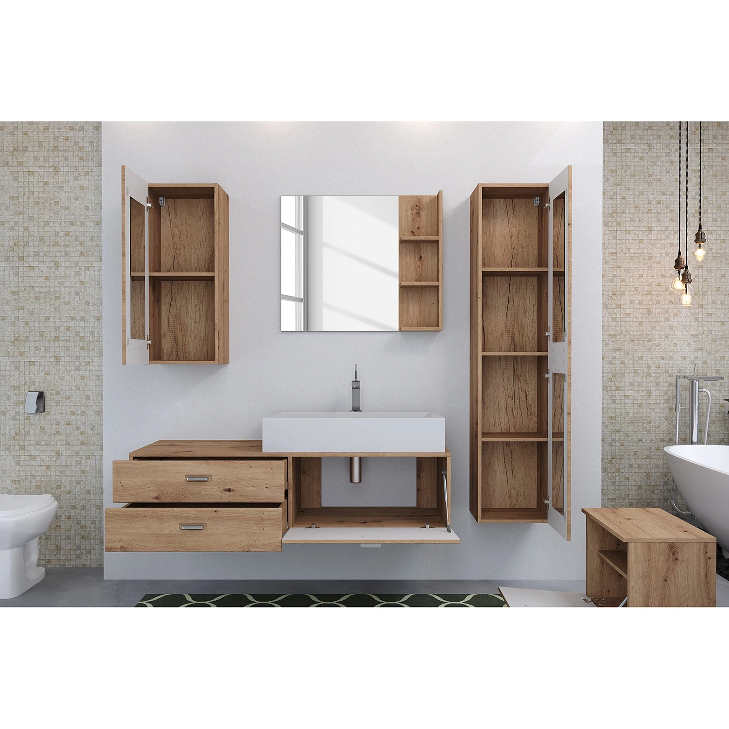 - Contenu de la livraison : Salle de bain comprenant 1 meuble avec vasque en fonte minérale, 1 miroir avec étagères, 1 colonne de salle de bain et 1 meuble haut