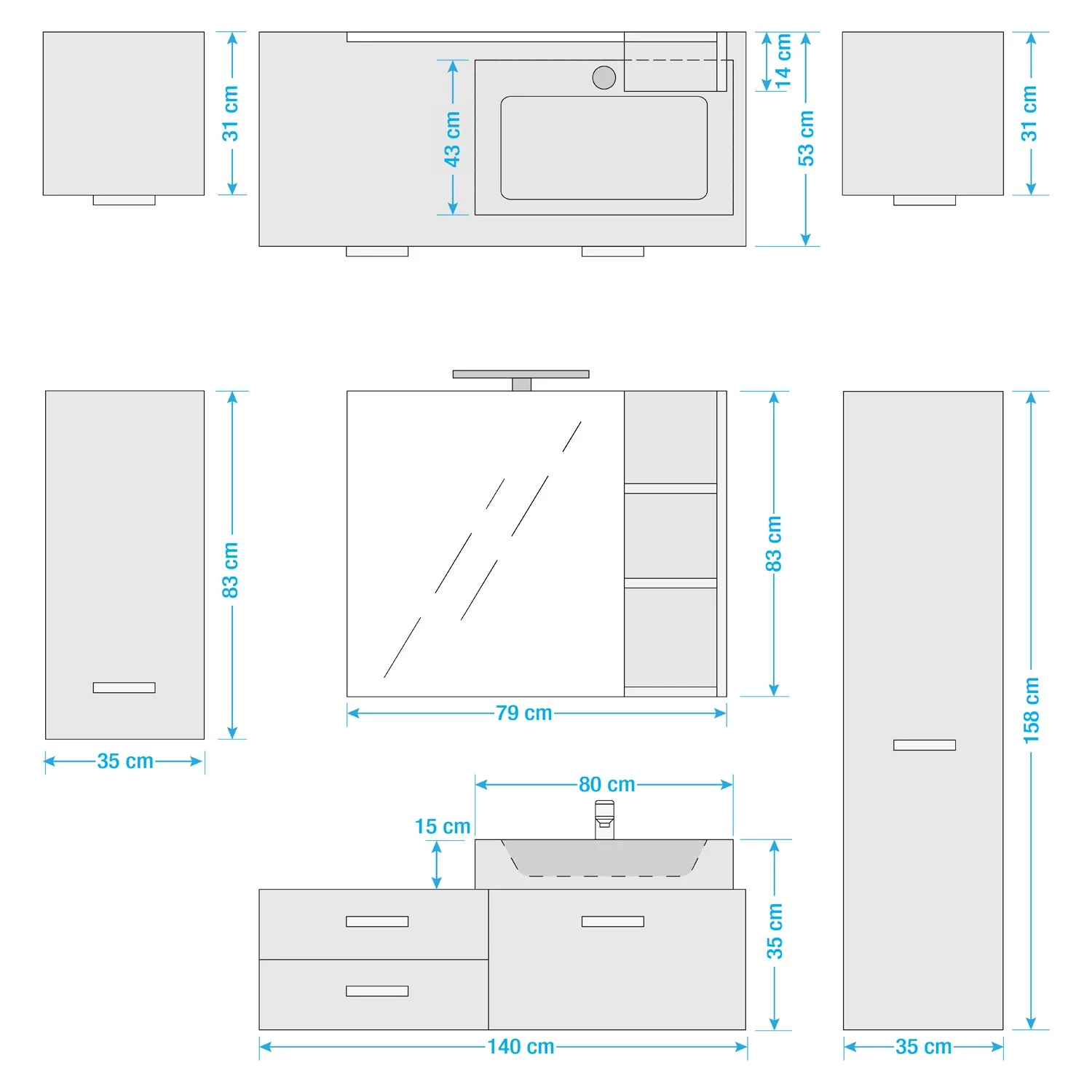 - Meuble sous vasque (L x H x P) : 140 x 35 x 53 cm