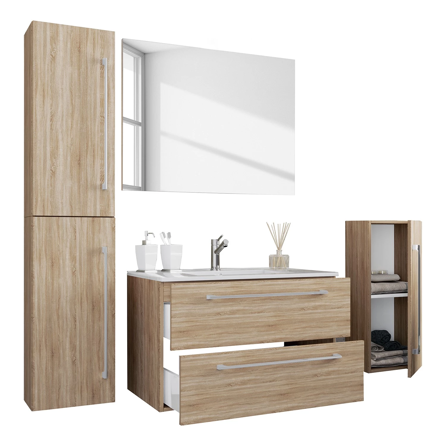 - Contenu de la livraison : Salle de bain comprenant 1 meuble avec vasque, 1 meuble bas, 1 colonne de salle de bain et 1 miroir, sans éclairage