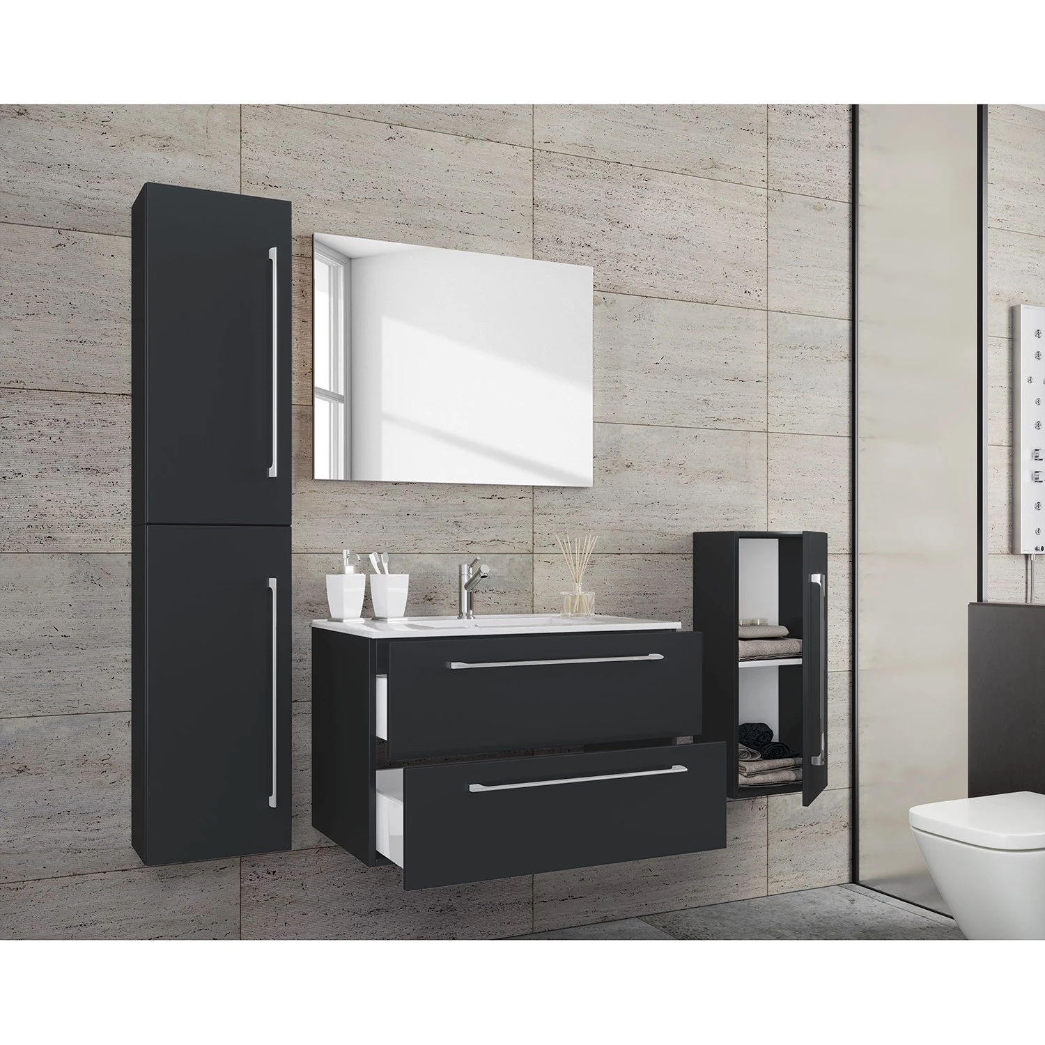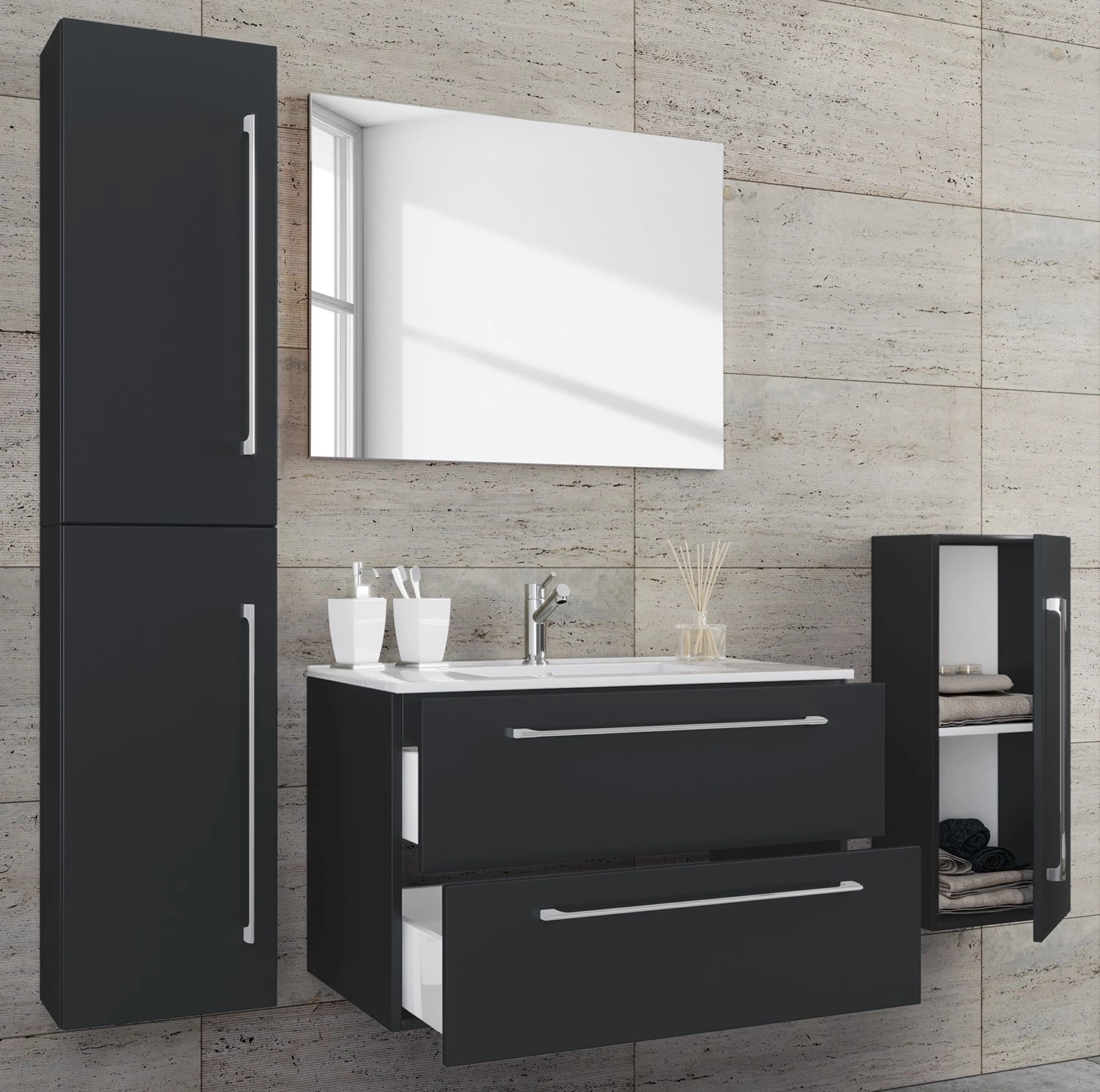 - Contenu de la livraison : Salle de bain comprenant 1 meuble avec vasque, 1 meuble bas, 1 colonne de salle de bain et 1 miroir, sans éclairage
