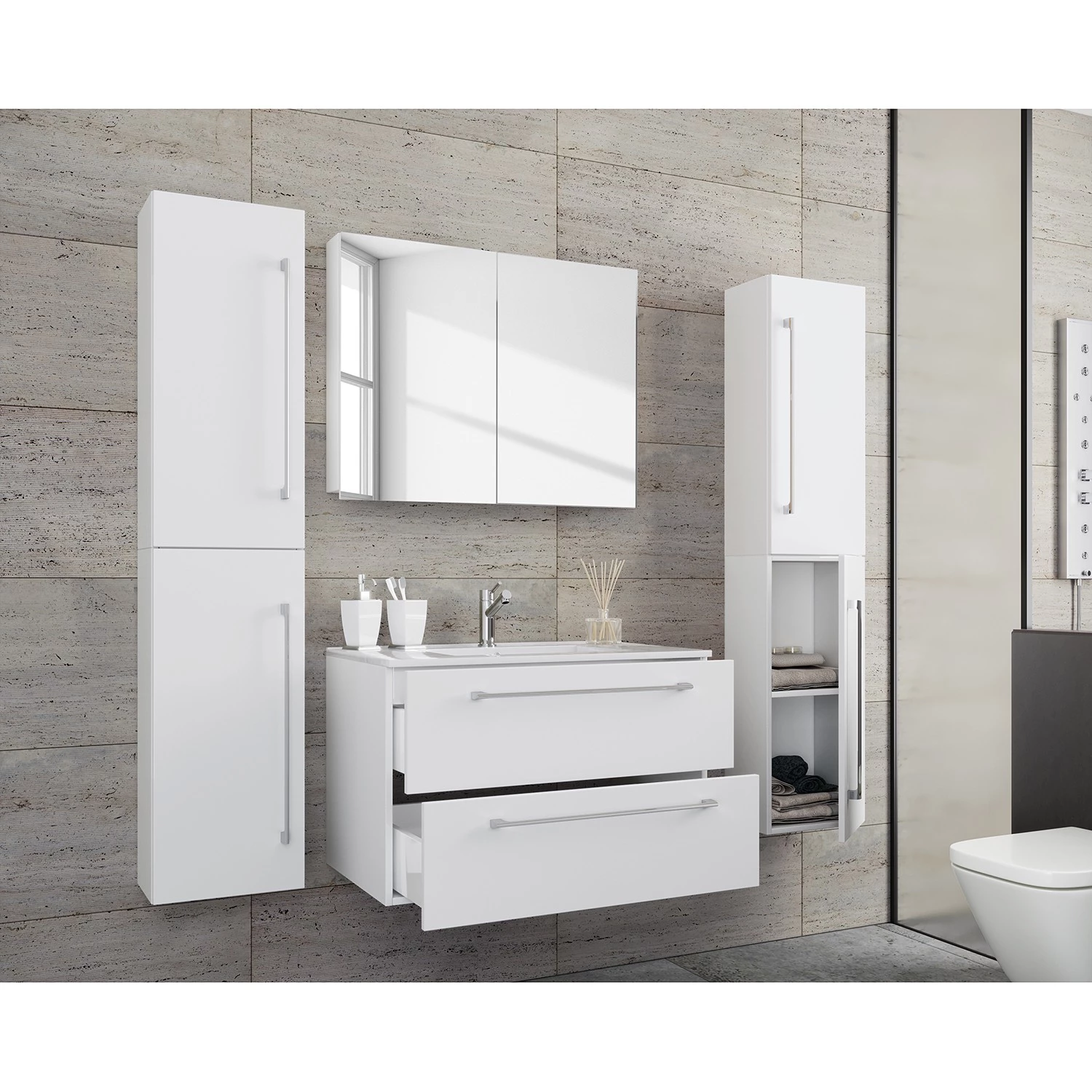 - Contenu de la livraison : Salle de bain comprenant 1 meuble avec vasque et 2 armoires de toilette et 1 miroir sans éclairage
