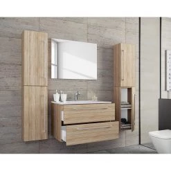 - Contenu de la livraison : Salle de bain comprenant 1 meuble avec vasque et 2 armoires de toilette et 1 miroir sans éclairage